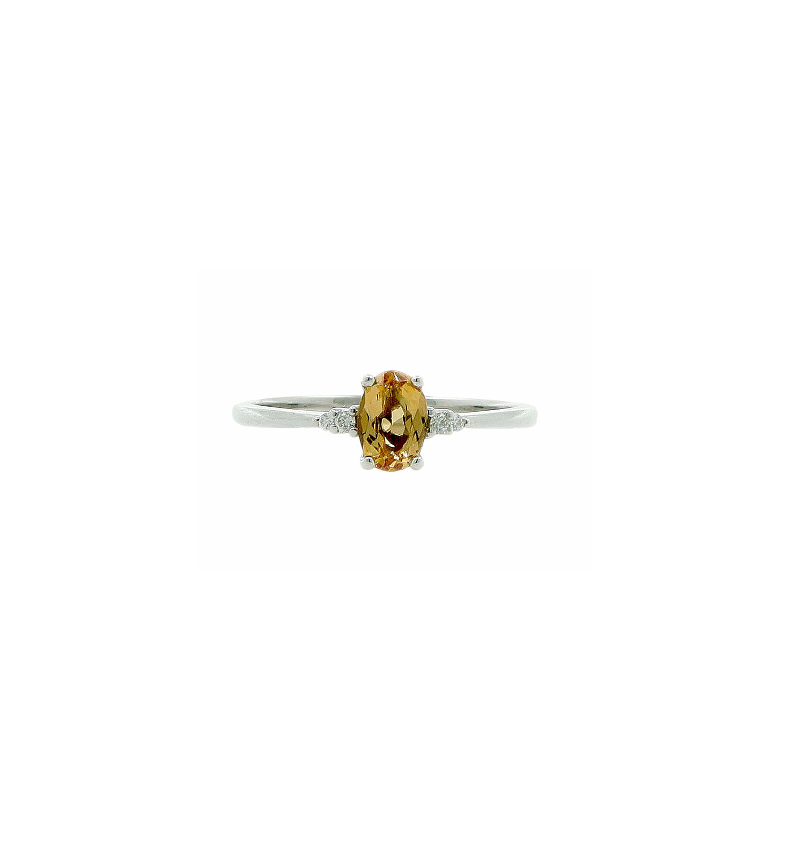 Montura con un topacio natural de 0.64 quilates, talla oval de 6.00 mm por 4.10 mm, engastado en cuatro garras. Con dos diamantes talla brillante engastados en garras a cada lado.