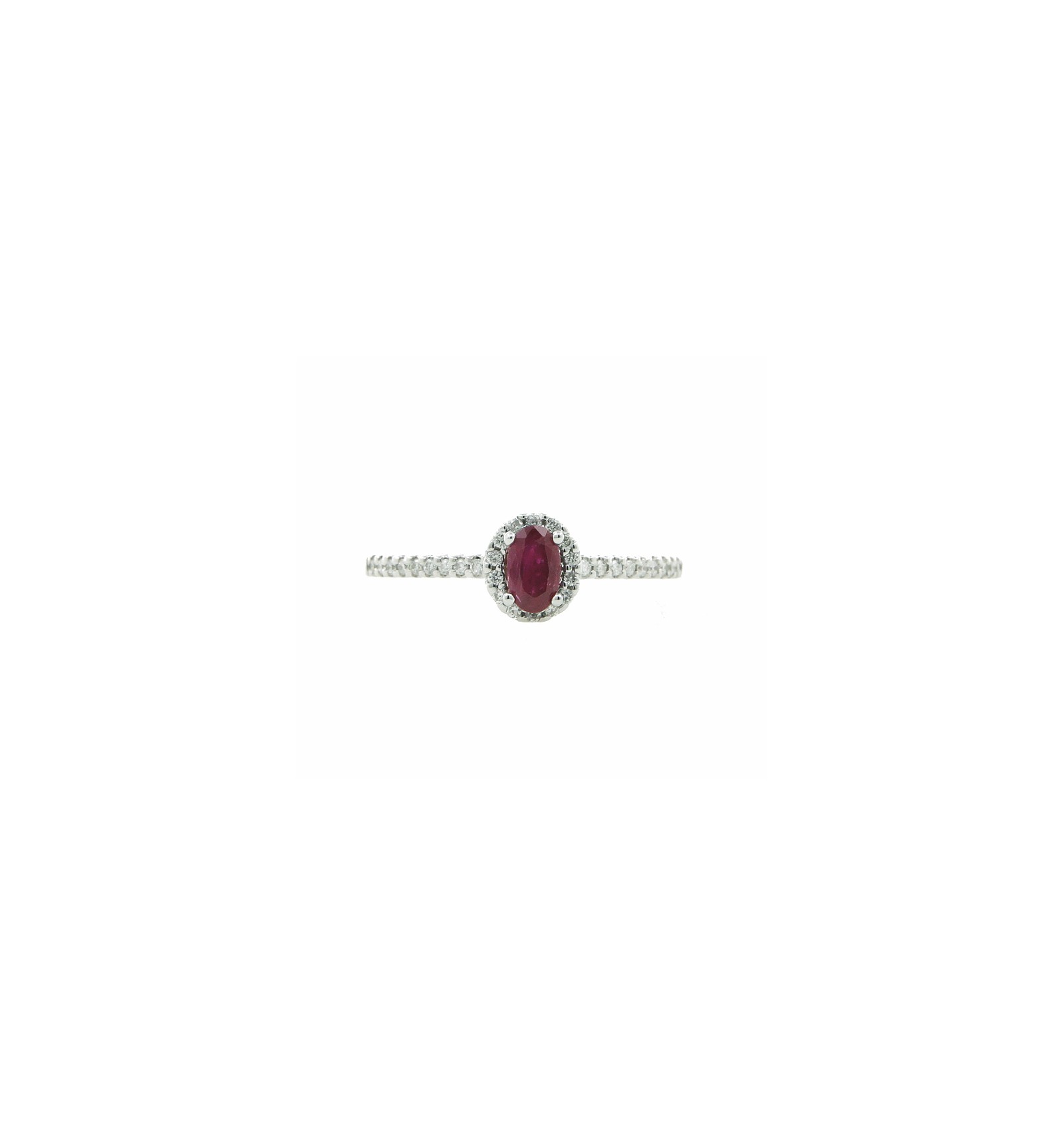 Montura con 32 diamantes talla brillante engastados en garras en el brazo y en una orla ovalada de 6.50 mm por 5.90 mm, con un rubí central talla oval de 5.20 mm por 3.20 mm.