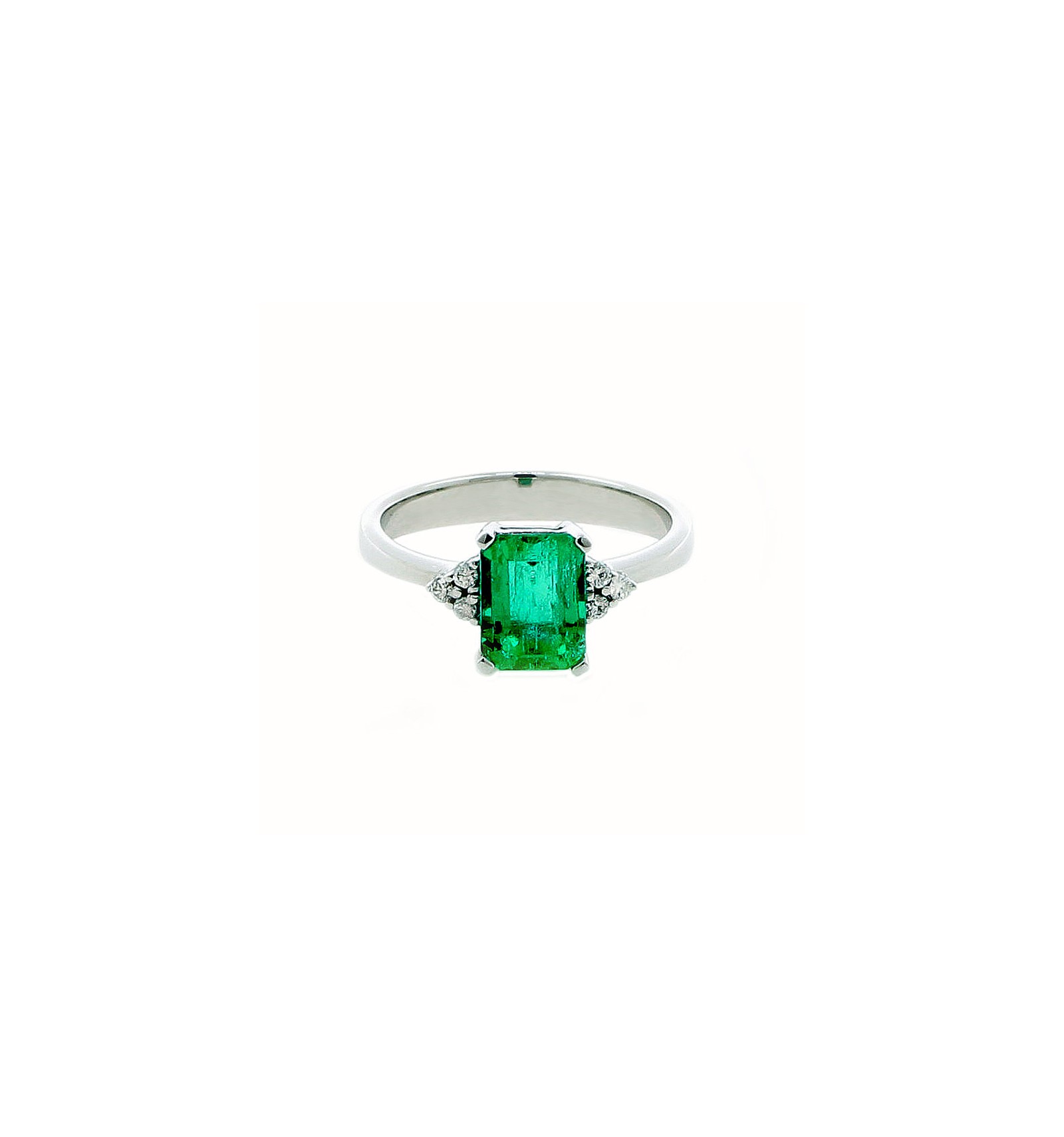 Sortija de oro blanco de 750 milésimas (18K) con diamantes y esmeralda natural.