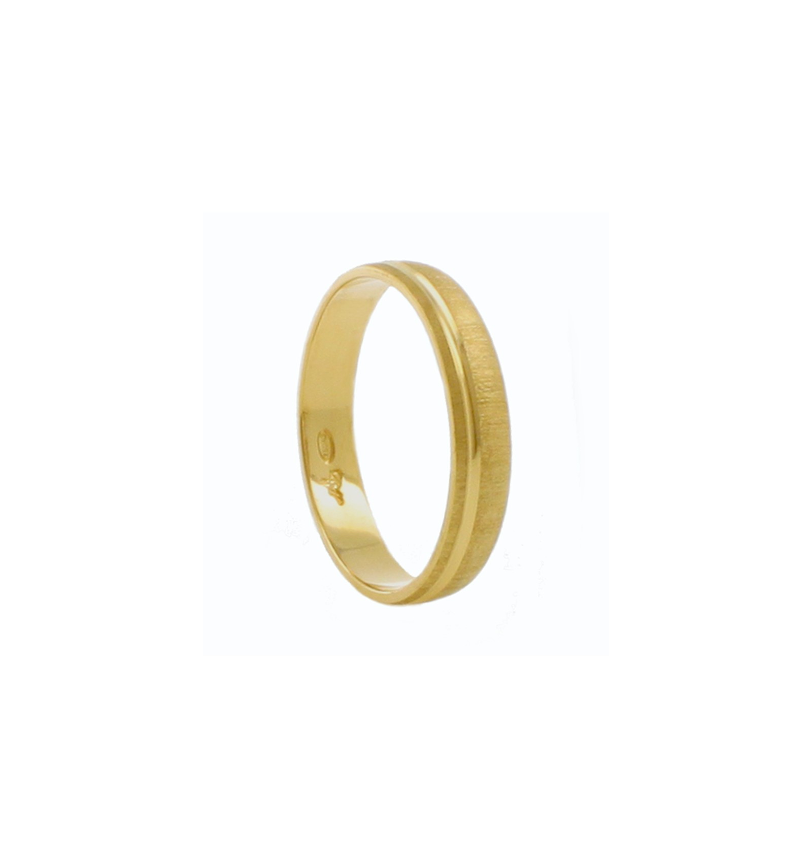 Alianza de media caña con matizado liso en oro amarillo, con detalle de surco en brillo en un lateral.