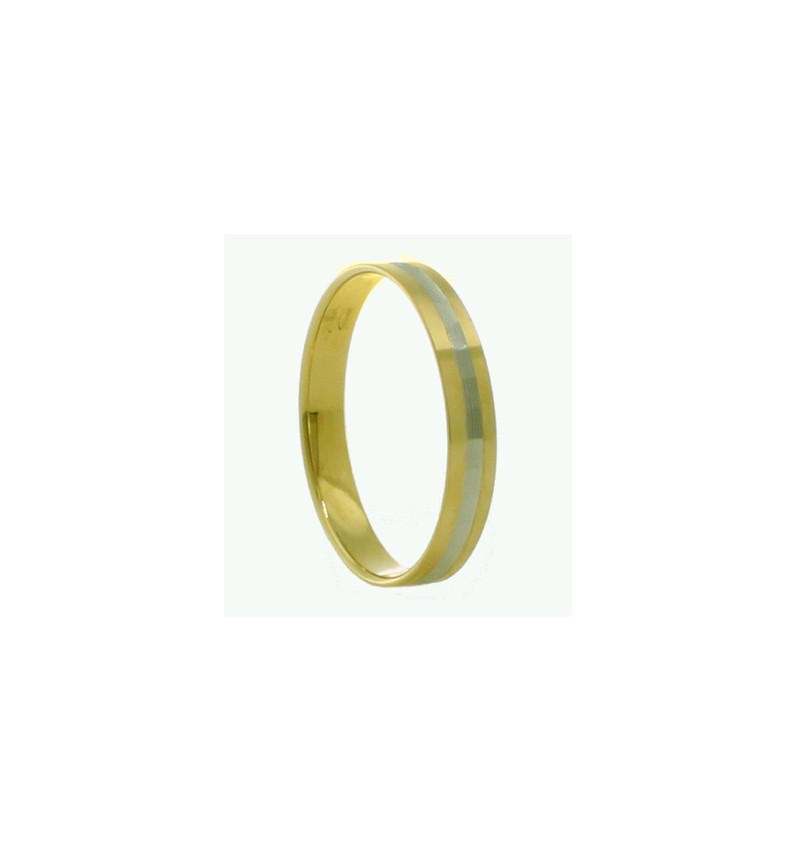Alianza plana de oro amarillo en brillo con un surco en en centro de oro blanco con rayas y efecto lapidado.