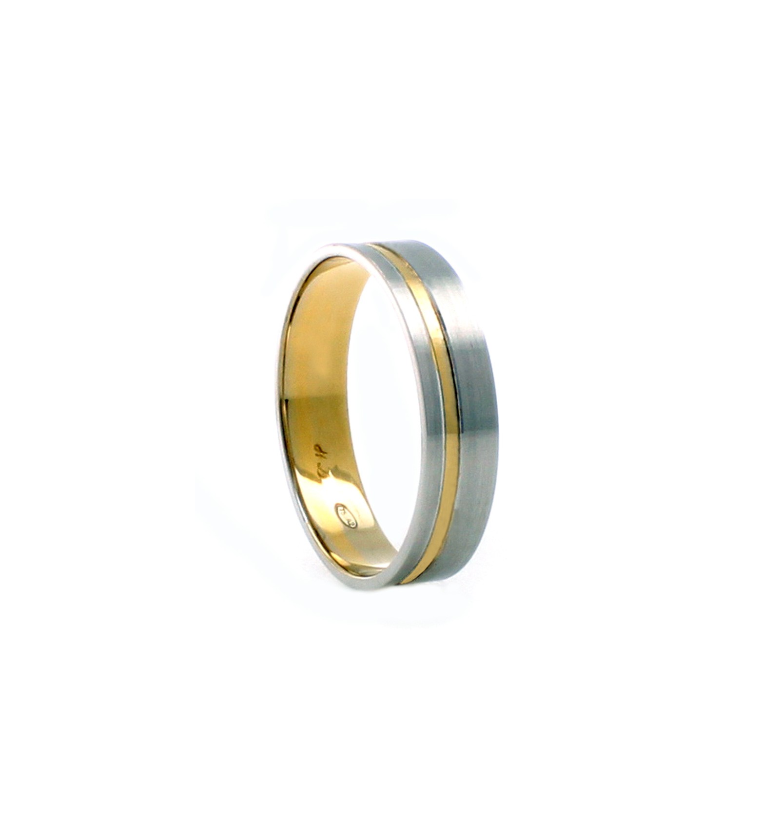 Alianza plana de oro blanco en mate con una franja en un lateral de oro amarillo en mate. Tiene dos surcos en brillo para delimitar los colores.