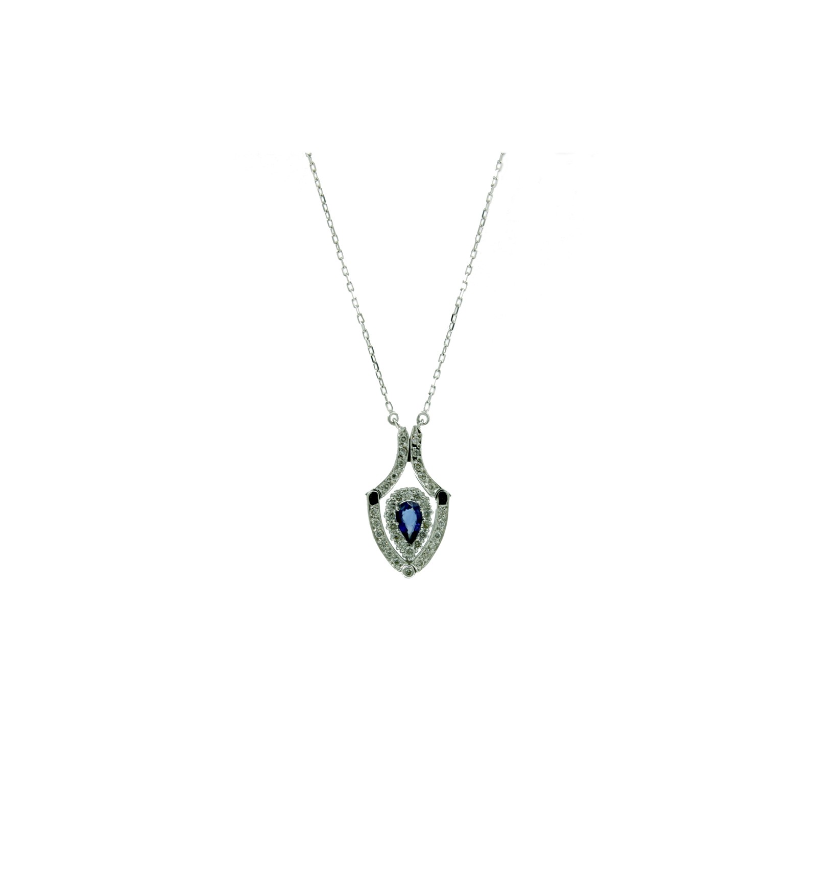 Colgante y cadena de oro blanco tipo forsat de 750 milésimas (18K) con diamantes talla brillante y zafiro azul talla perilla.