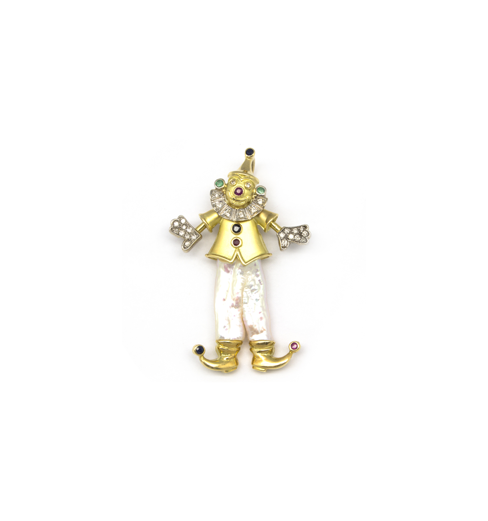 Colgante circense de oro amarillo y oro blanco de 750 milésimas (18K) con 26 diamantes talla brillante, rubÍes, esmeraldas, zafiros y perla barroca.