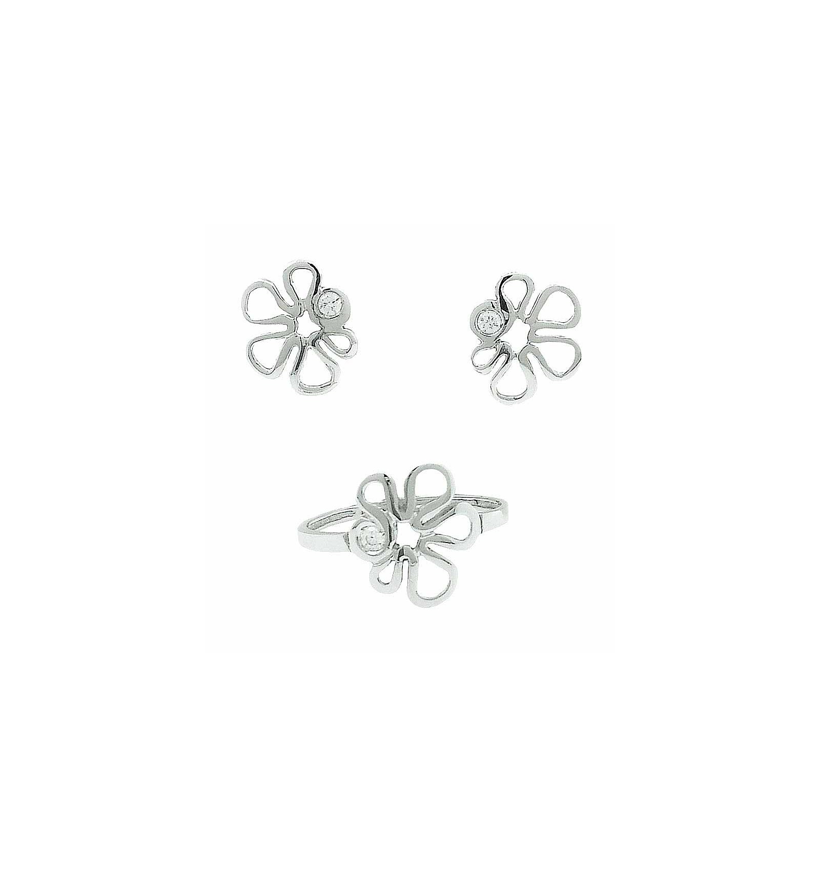 Juego de comunión para niña compuesto por pendientes y sortija de oro blanco en brillo con circonitas. Montura calada con forma de flor.
