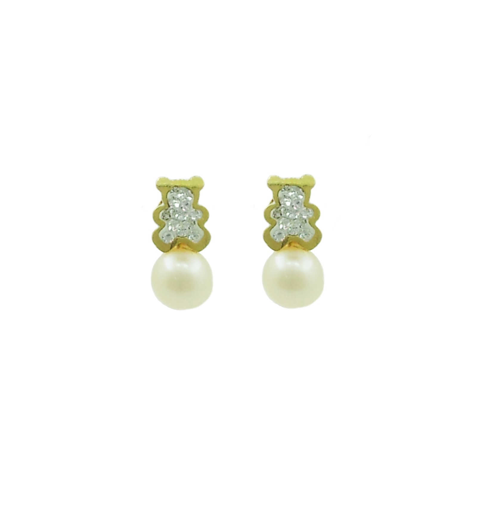 Montura de oro amarillo en brillo con forma de osito con circonitas, y perla de 5.00 mm.