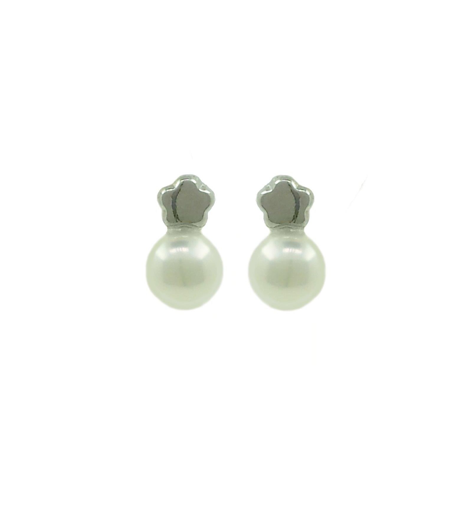 Montura de oro blanco en brillo con forma de flor de cinco pétalos, y perla de 7.00 mm.