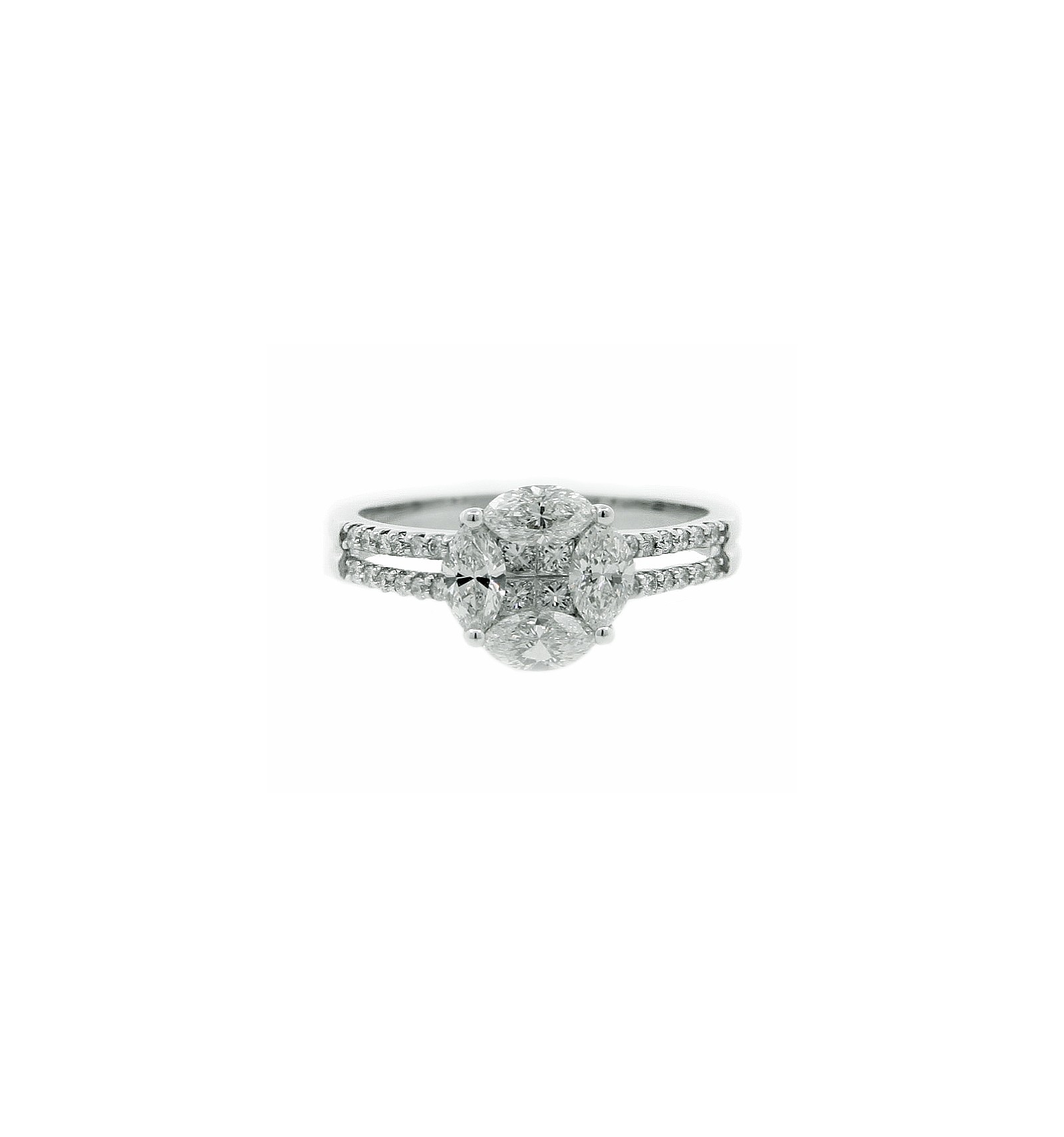 Sortija de oro blanco de 750/1000 milésimas (18K) con diamantes de diferentes tallas. En la parte superior podemos encontrar cuatro diamantes talla princesa (.011ct) rodeados de cuatro diamantes talla marquise (0.78ct). En el brazo lleva engastados 28 diamantes talla brillante (0.14ct). El peso total de los diamantes es de 1.03 quilates. Color H (Wesselton) y pureza VS.