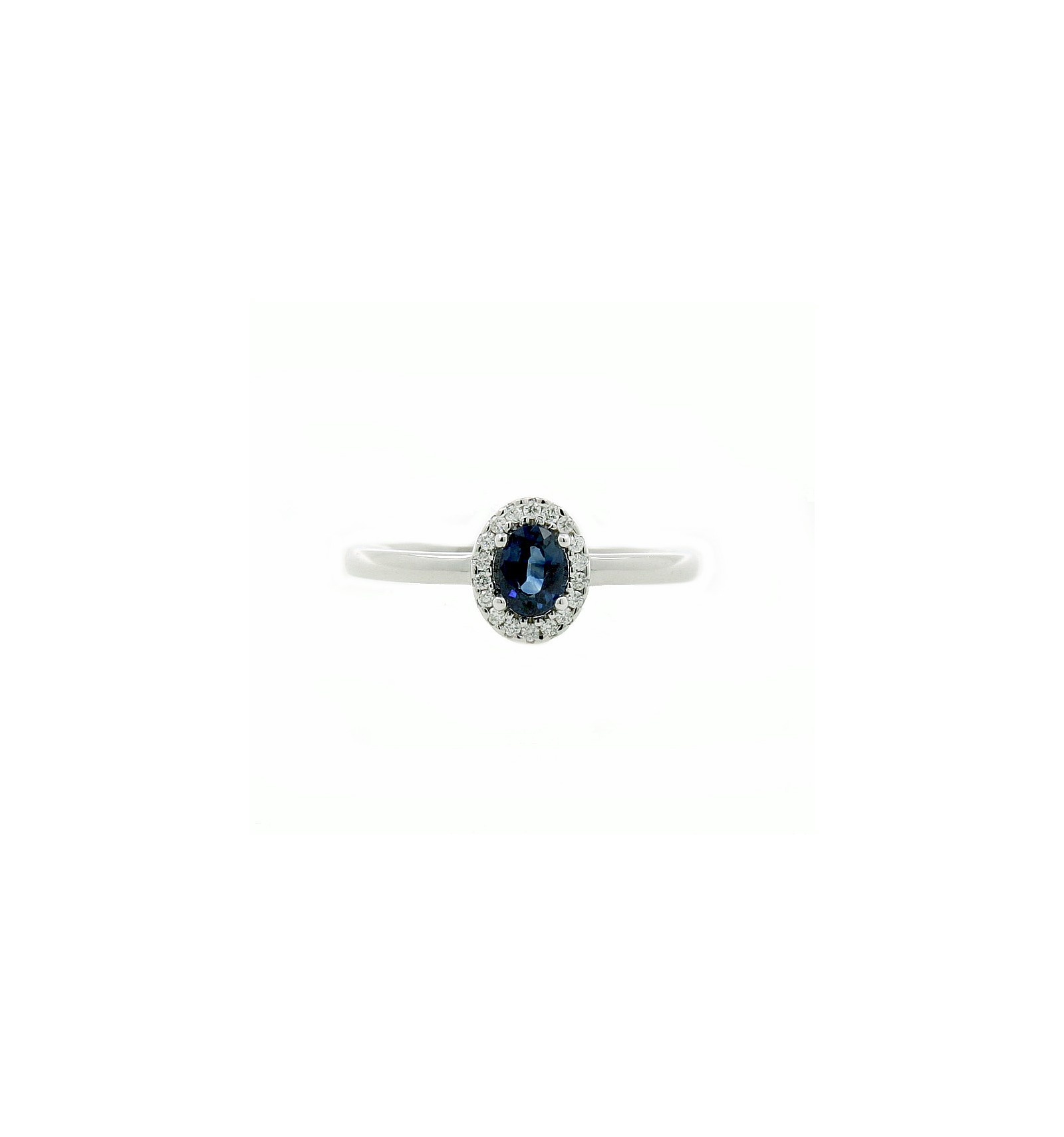 Montura con una orla de 9.30 mm por 7.90 mm con 20 diamantes talla brillante y un zafiro natural talla oval de 7.00 mm por 4.90 mm de 0.90K. Todo engastado en garras.