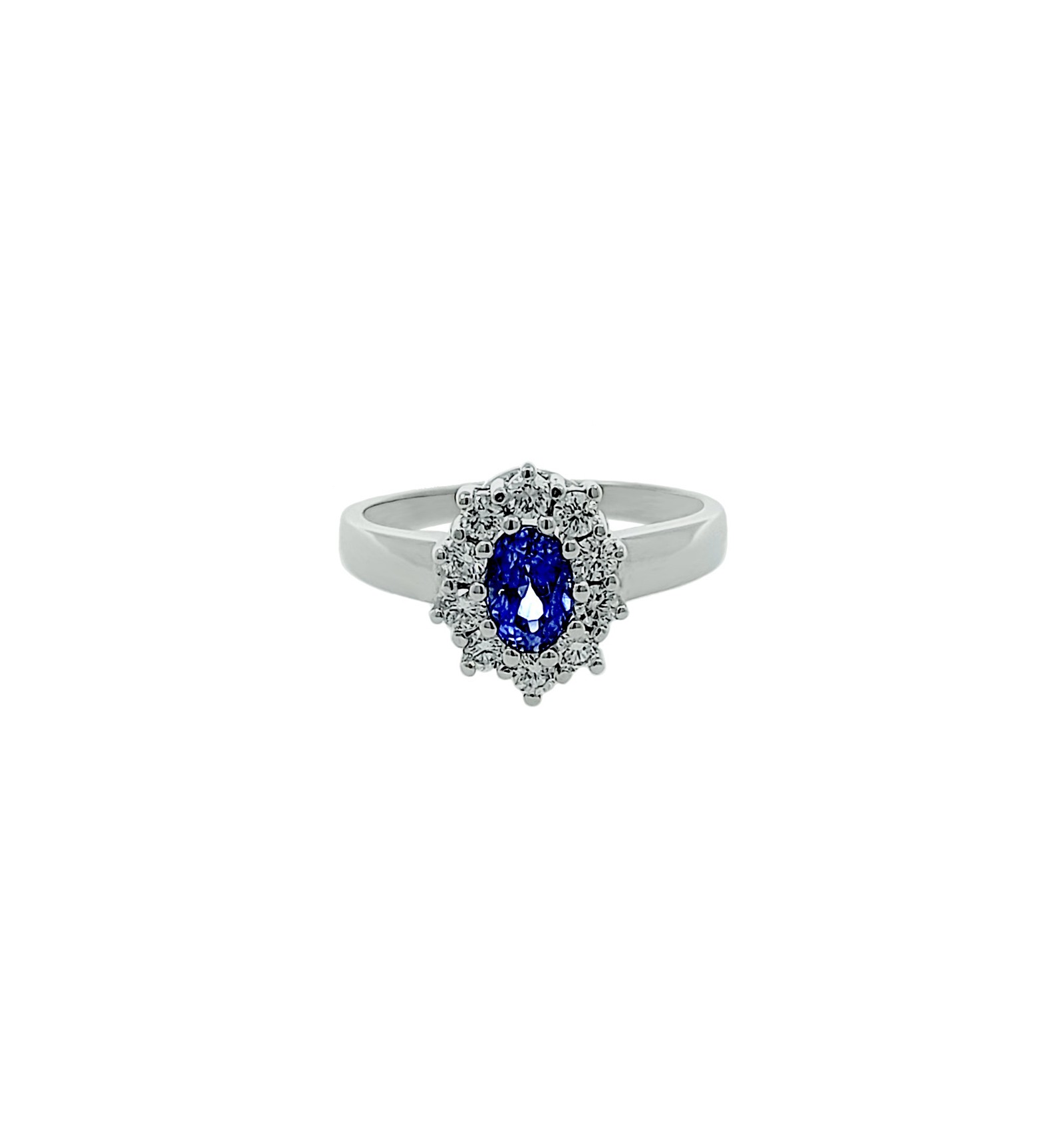Roseta de 10.90 mm por 9.05 mm con diez diamantes engastados en garras, y un zafiro contral talla oval también engastado en garras.