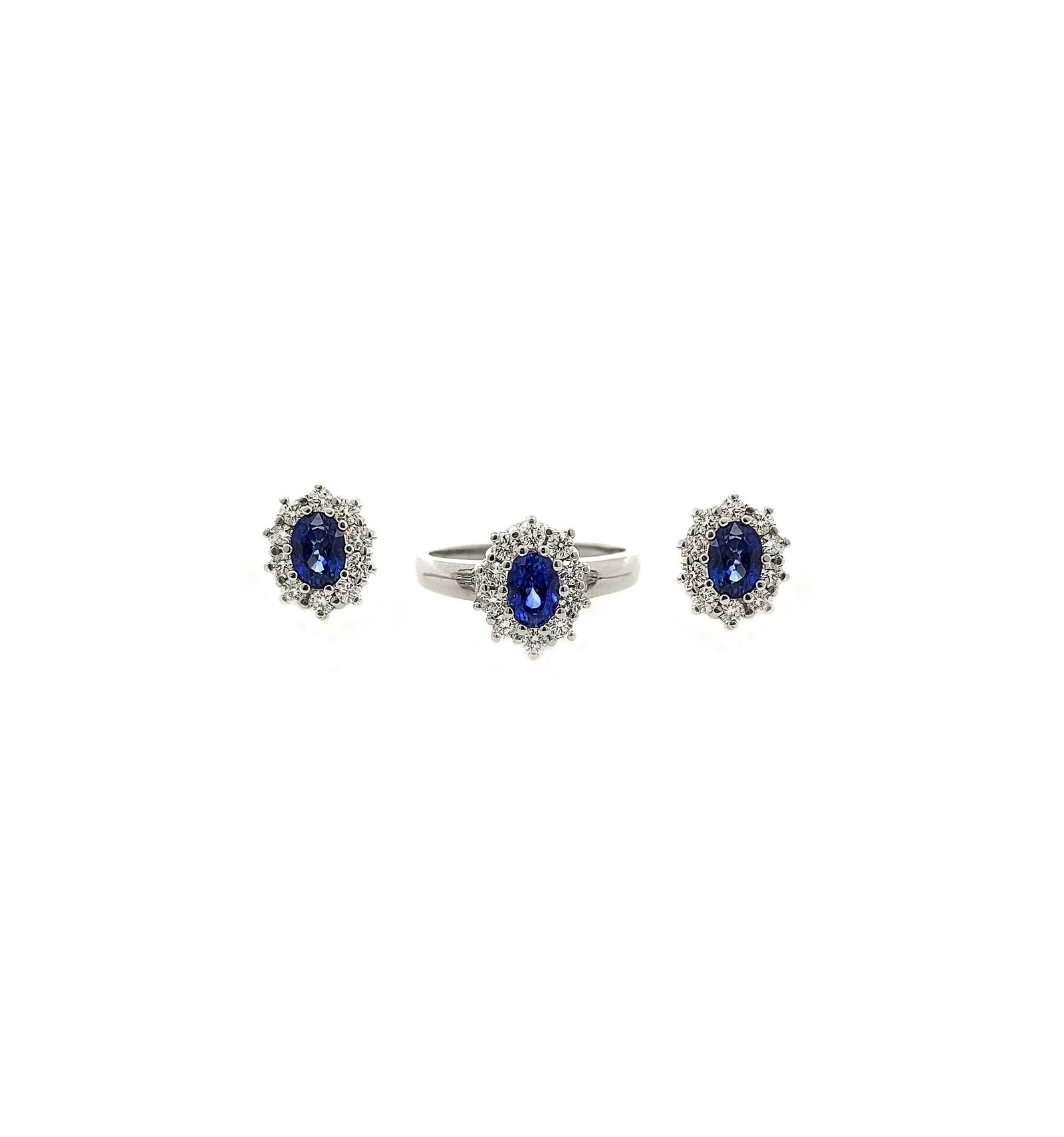 Juego en oro blanco de 750 milésimas (18K) con 30 diamantes talla brillante y 3 zafiros talla oval.