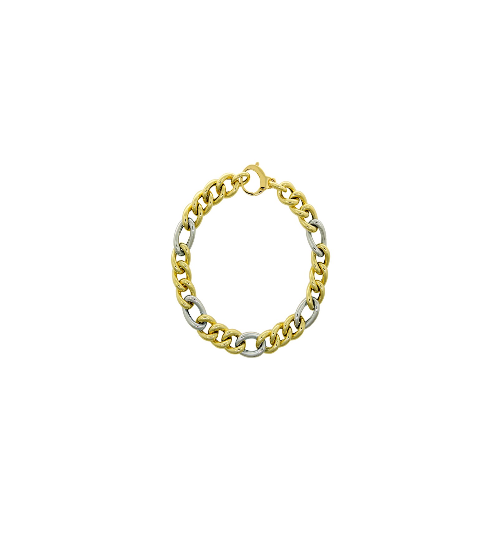Pulsera de eslabones, modelo barbada, combinada en oro blanco y oro amarillo toda en brillo.