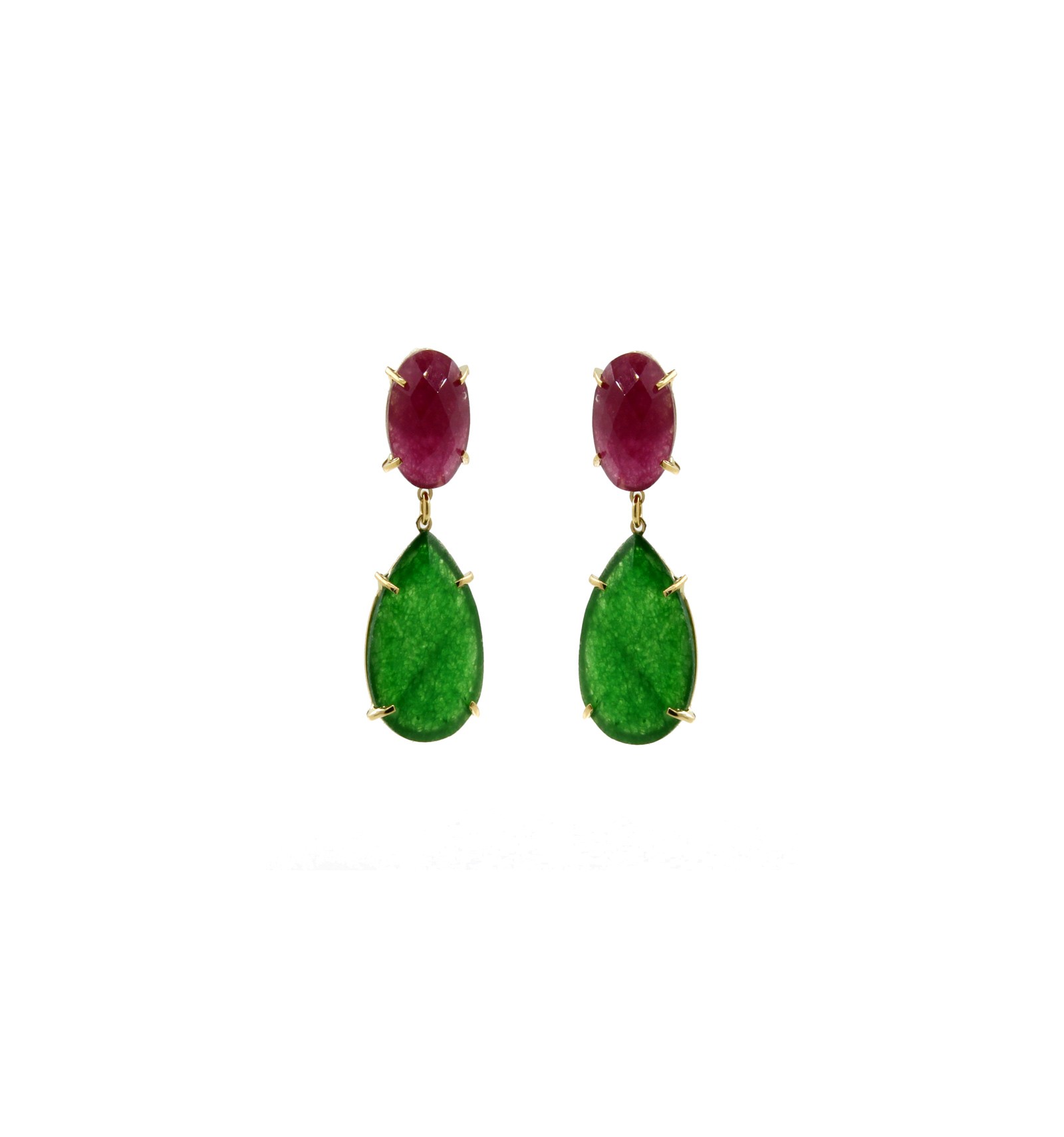 Montura articulada de oro amarillo en brillo con dos Jades de Malasia engastados en cuatro garras. Uno en tonos rosas y el otro en verde.