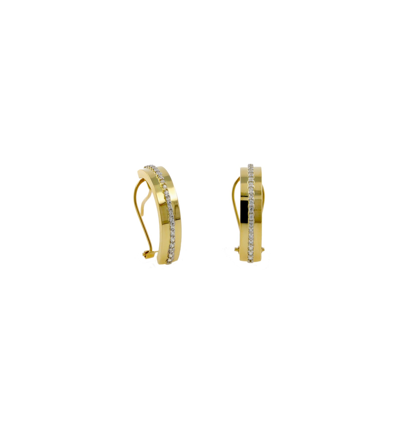 Montura de oro amarillo en brillo con circonitas engastadas en garras en la parte central. Los pendientes tienen forma de media criolla.