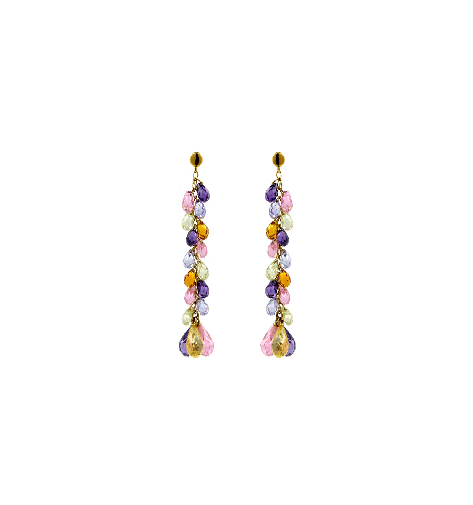 Los colores de las piedras son morado, amarillo, rosa, marrón, verde y azul. Todas ellas de diferente tamaño y talla briolette.