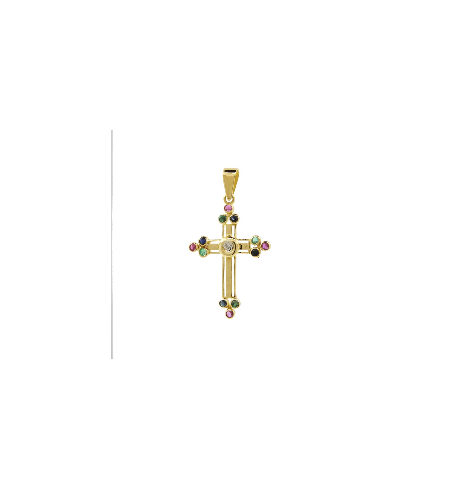 Cruz de oro amarillo de 750 milésimas (18K) con cuatro rubíes, cuatro esmeraldas, cuatro zafiros y un diamante en el centro.