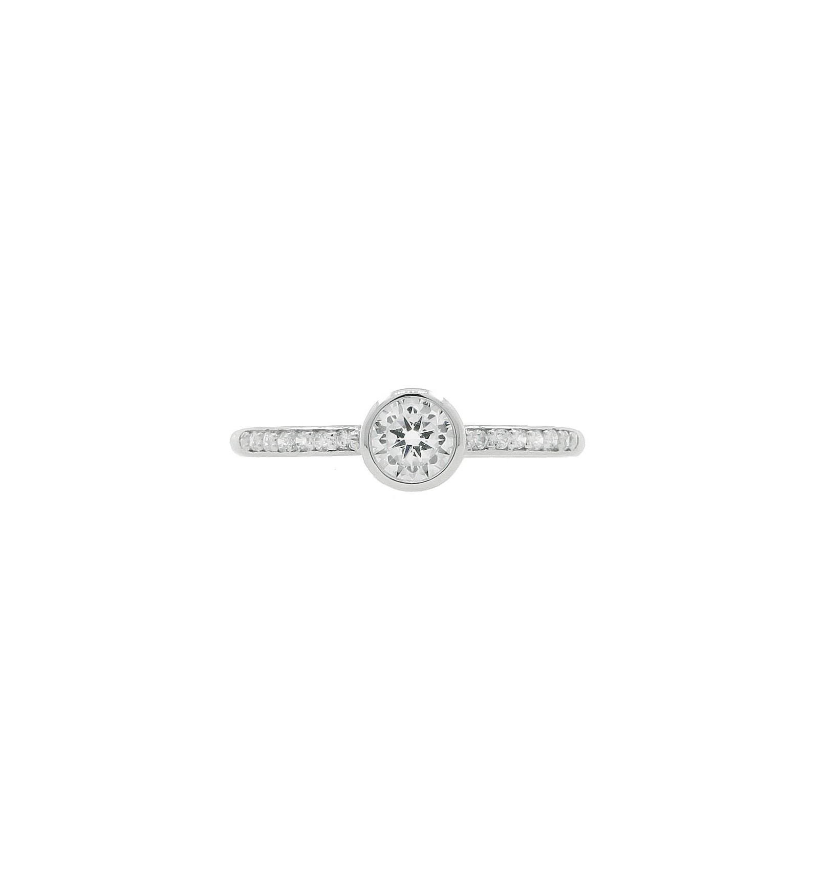 Sortija de oro blanco de 750 milésimas (18K) con una circonita central engastada en chatón y otras doce circonitas laterales engastadas en garritas.