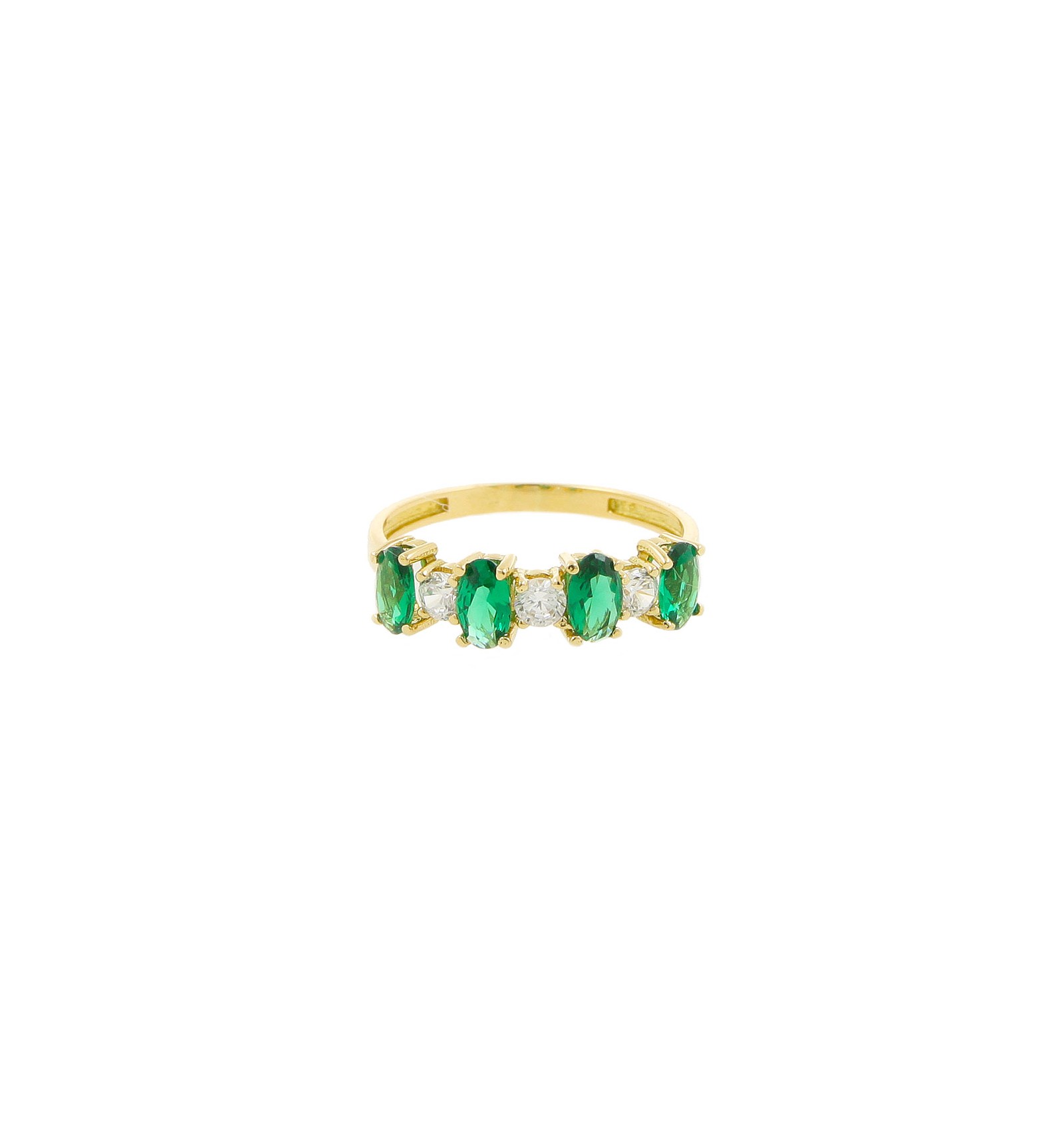 Montura con cuatro circonitas blancas talla brillante y cuatro circonitas de color verde esmeralda talla oval, todas engastadas en garras.
