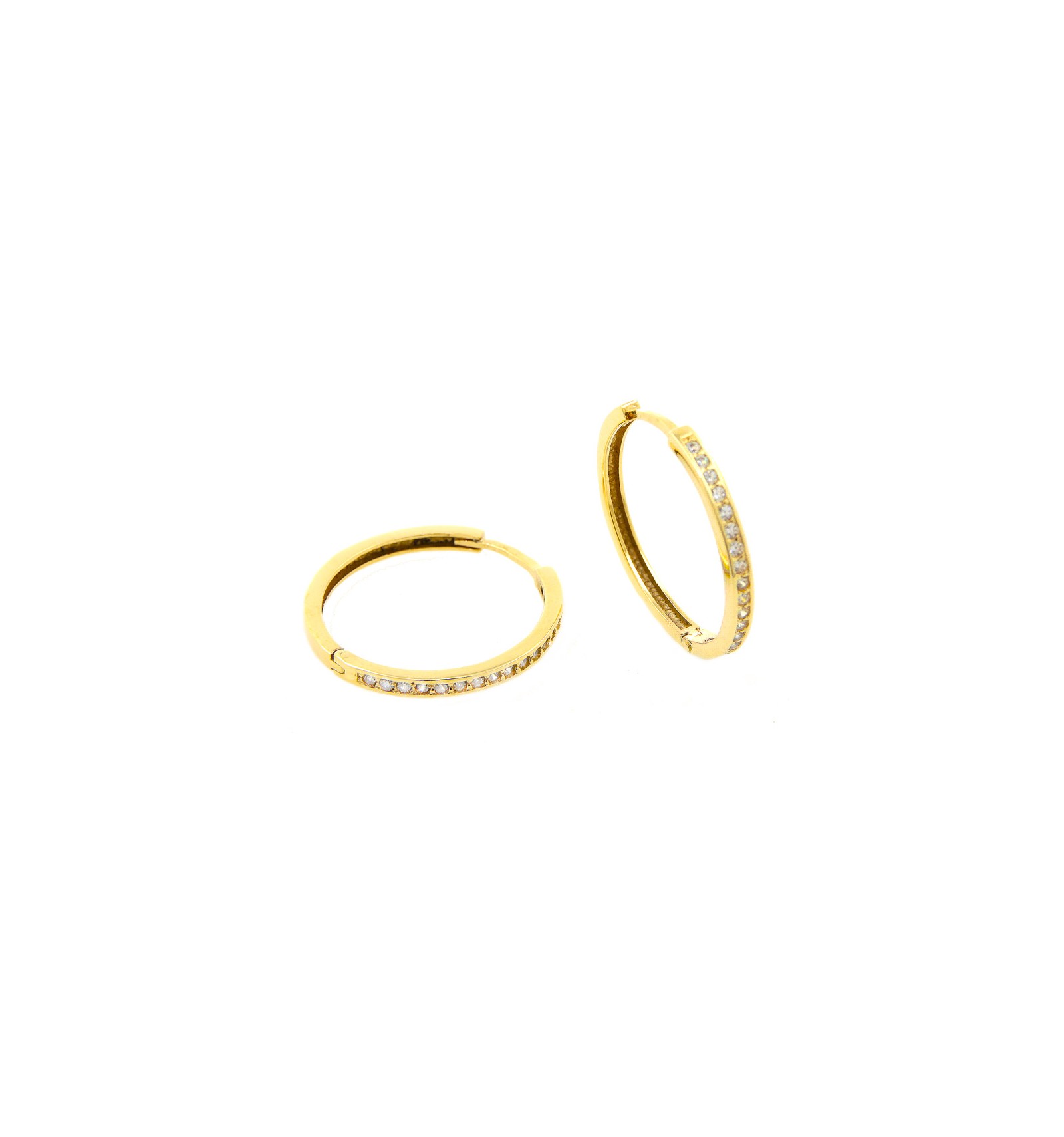Pendientes de aro de oro amarillo de 18K (750/1000 mlm) engastados con circonitas. Apertura con bisagra inferior tienen cierre de click. Miden 22mm de diámetro y 2,10mm de grosor. Fabricados en España.