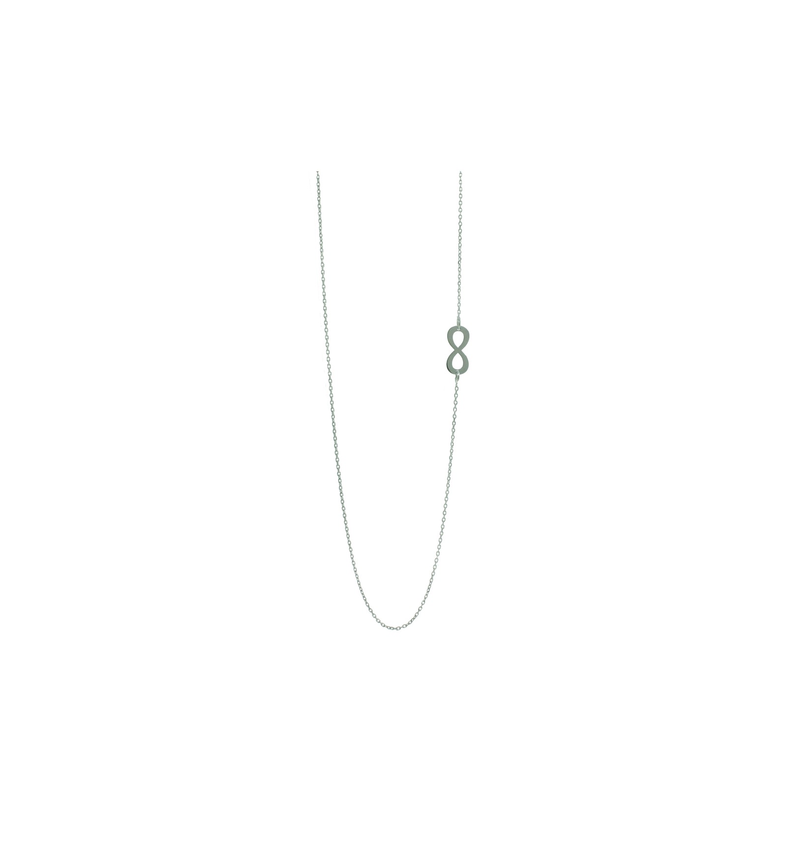 Colgante de oro blanco en brillo con forma de símbolo de infinito y cadena de oro blanco.