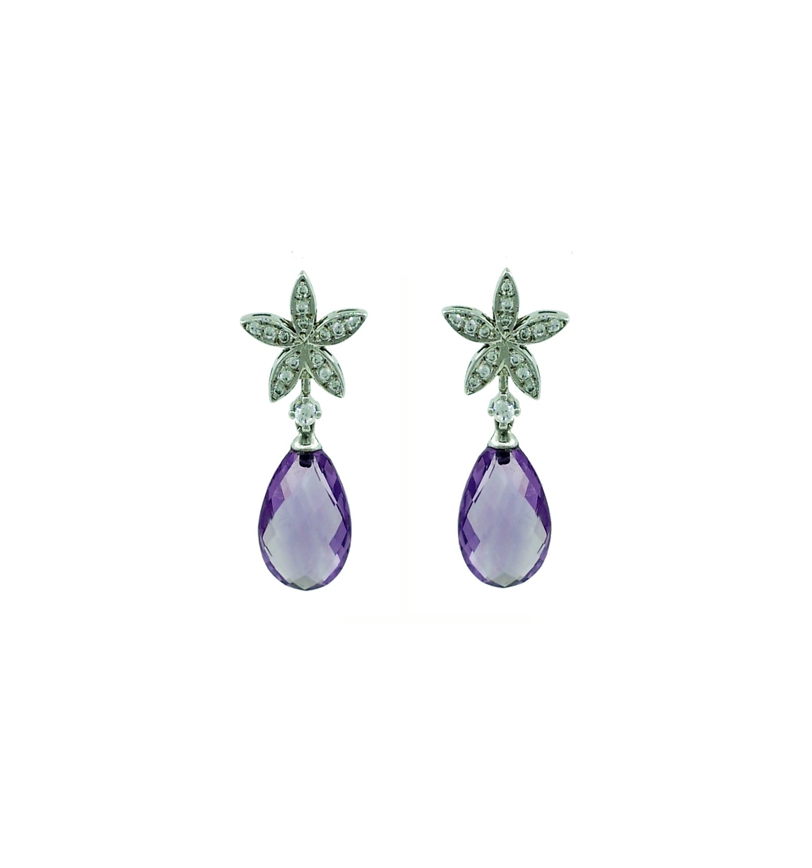 Par de pendientes oro blanco de 750 milésimas (18K) con circonitas y amatista talla briolette.