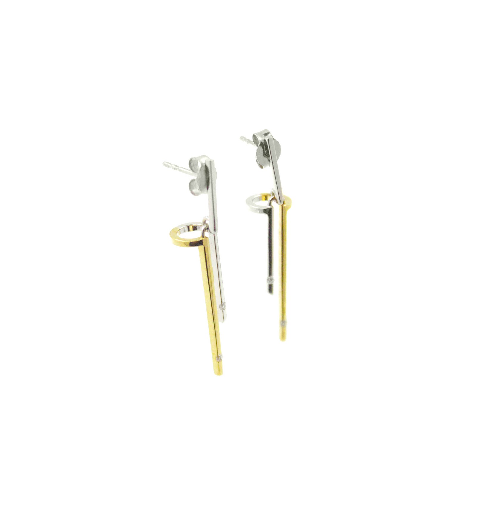 Una original montura de oro blanco y oro amarillo todo en brillo. El pendientes encaja debajo del lóbulo.