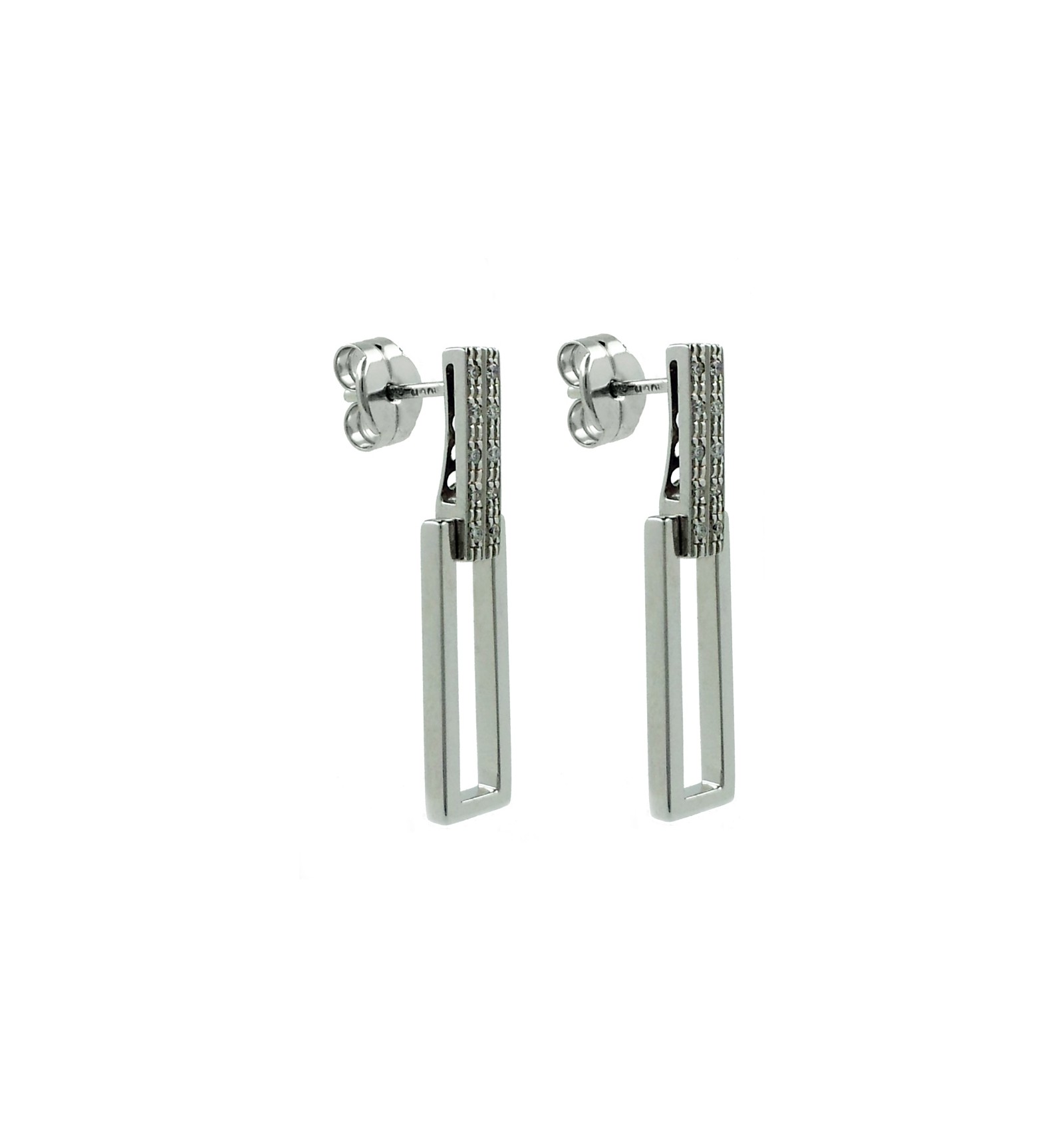 Montura articulada de oro blanco en brillo, con diez diamantes engastados en garras en doble hilera en cada pendiente.