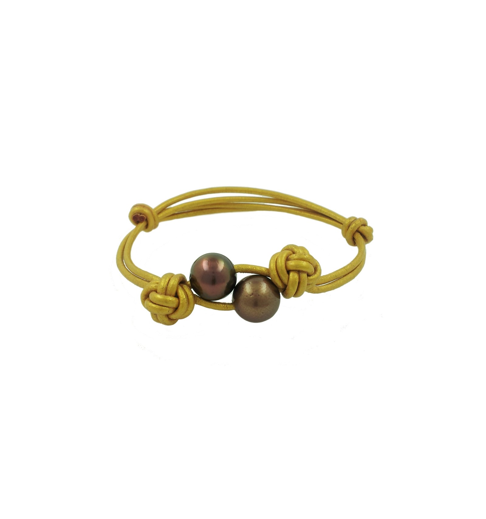 Pulsera de cuero dorado con dos perlas naturales color chocolate remetadas por dos nudos.