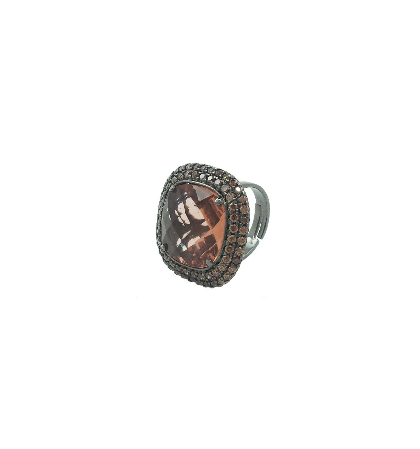 Un moderno diseño de sortija de plata con baño de rutenio. Con una piedra central de color cuarzo ahumado con dos orlas de circonitas del mismo color.