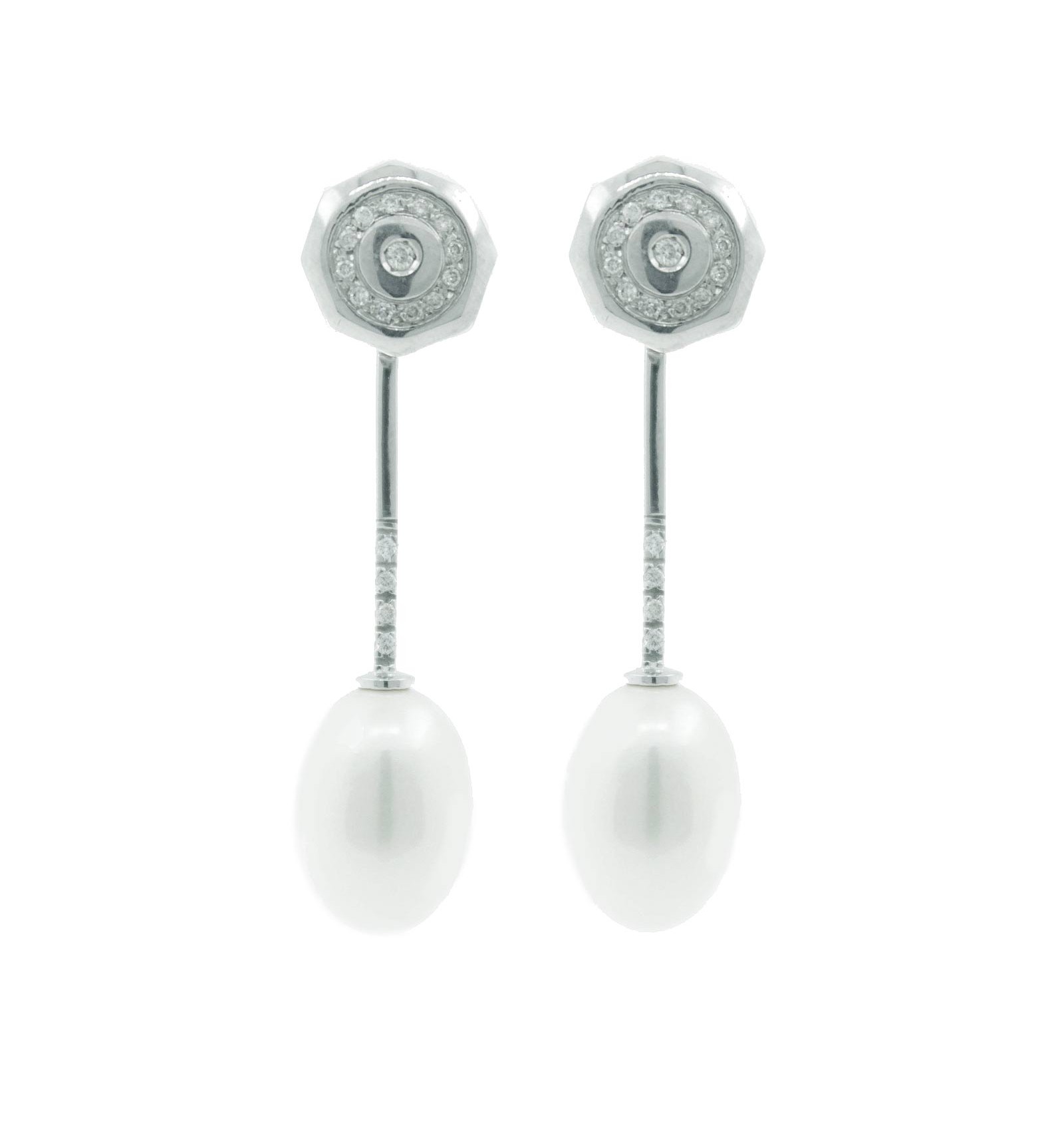 Par de pendientes de oro blanco de 750 milésimas (18K) con diamantes talla brillante y perla cultivada.