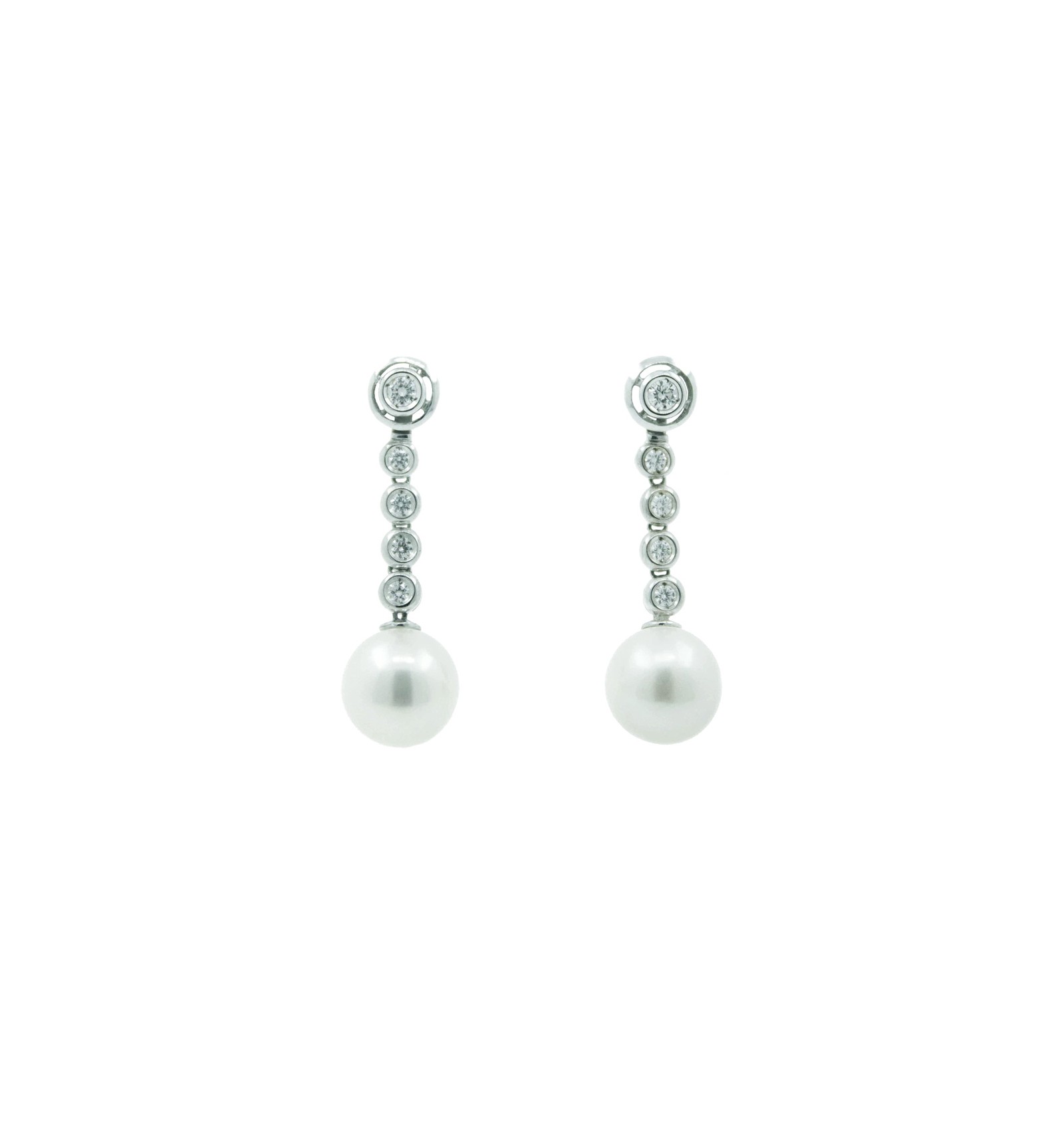 Par de pendientes de oro blanco con diamantes talla brillante y perla cultivada con forma de pera de 11.00 mm de anchura.