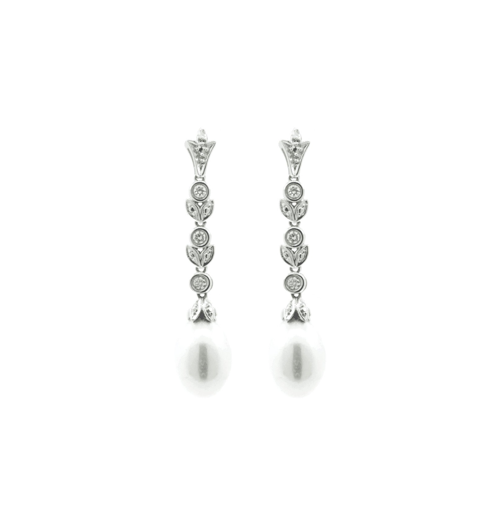 Montura articulada con chatones rodondos y forma de hoja, y perla cultivada con forma de pera de 9.50 milímetros de anchura.