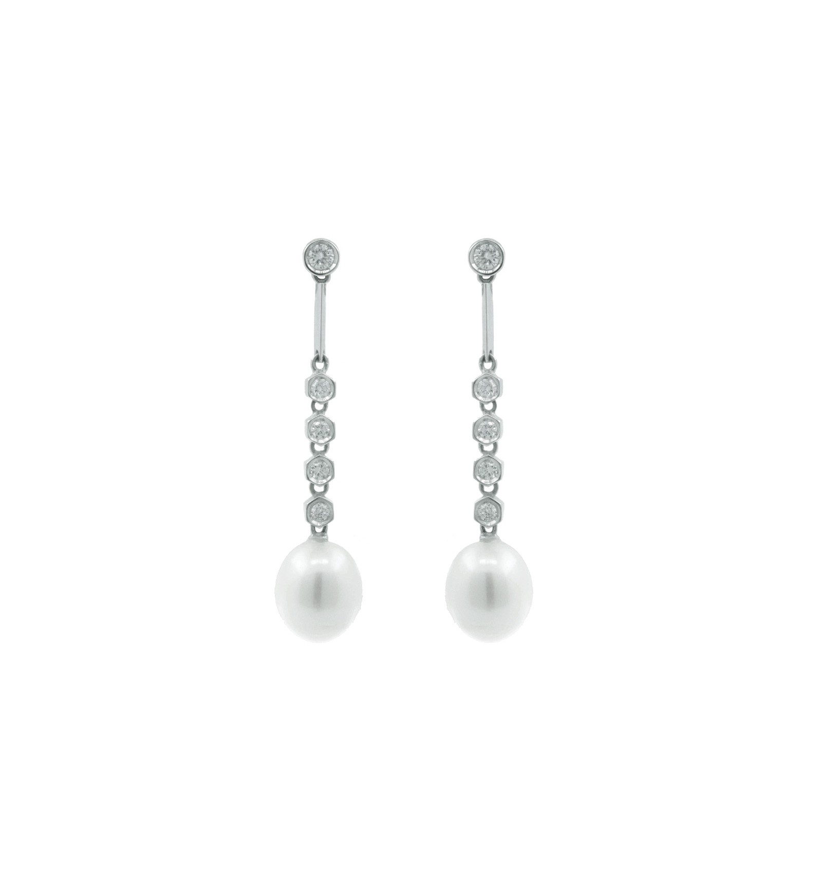 Par de pendientes de oro blanco de 750 milésimas (18K) con diamantes talla brillante y perla cultivada.