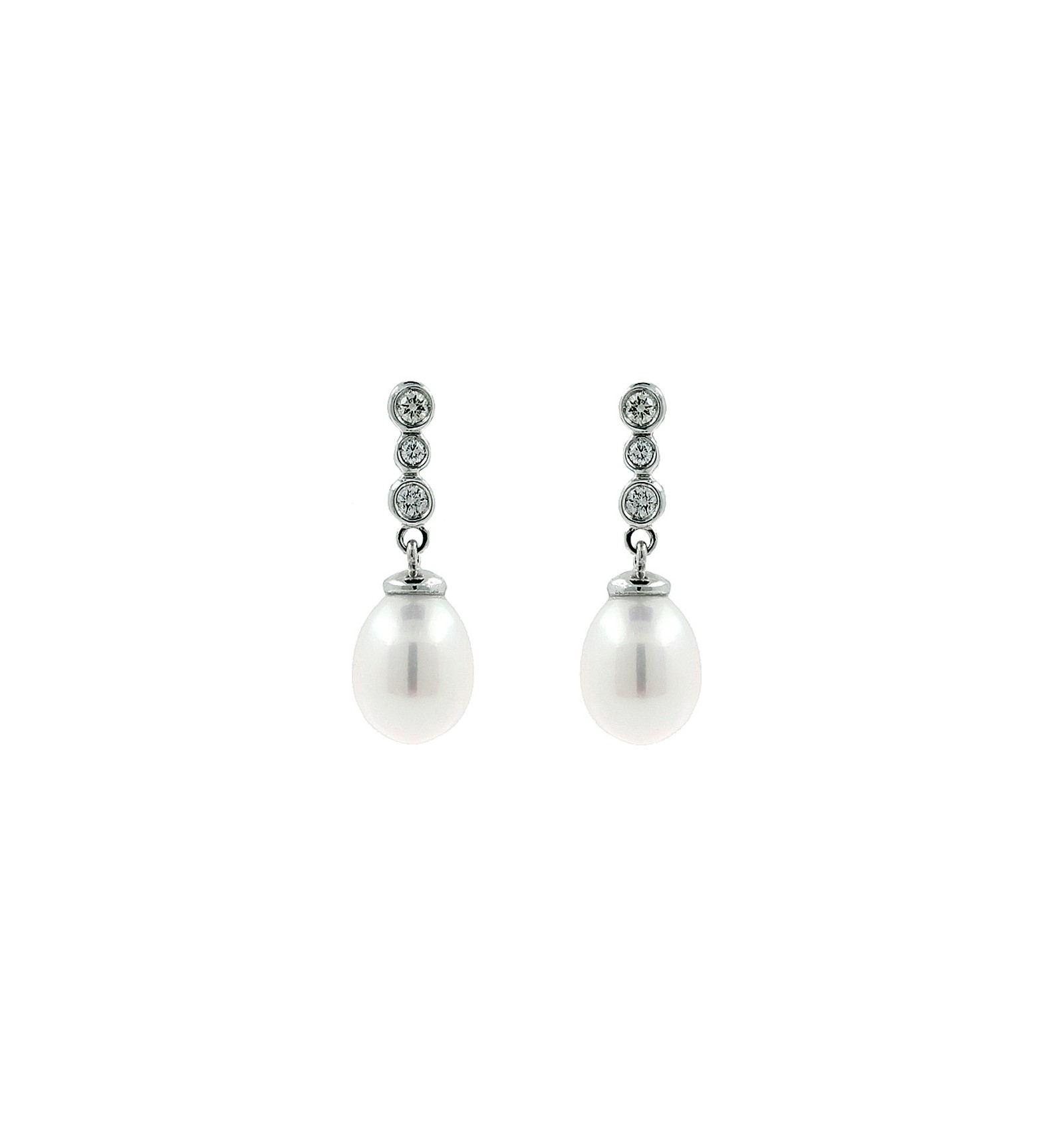 Montura de oro blanco con diamantes engastados en tres chatones redondos, y perla cultivada con forma de pera de 11.00 mm de anchura.