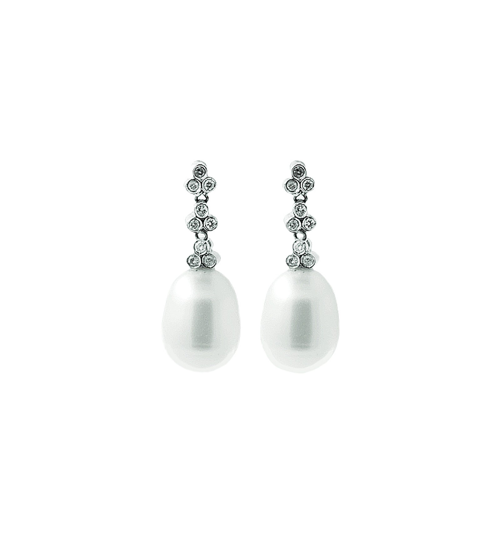 Par de pendietnes de oro blanco de 750 milésimas (18K) con diamantes talla brillante y perla cultivada.
