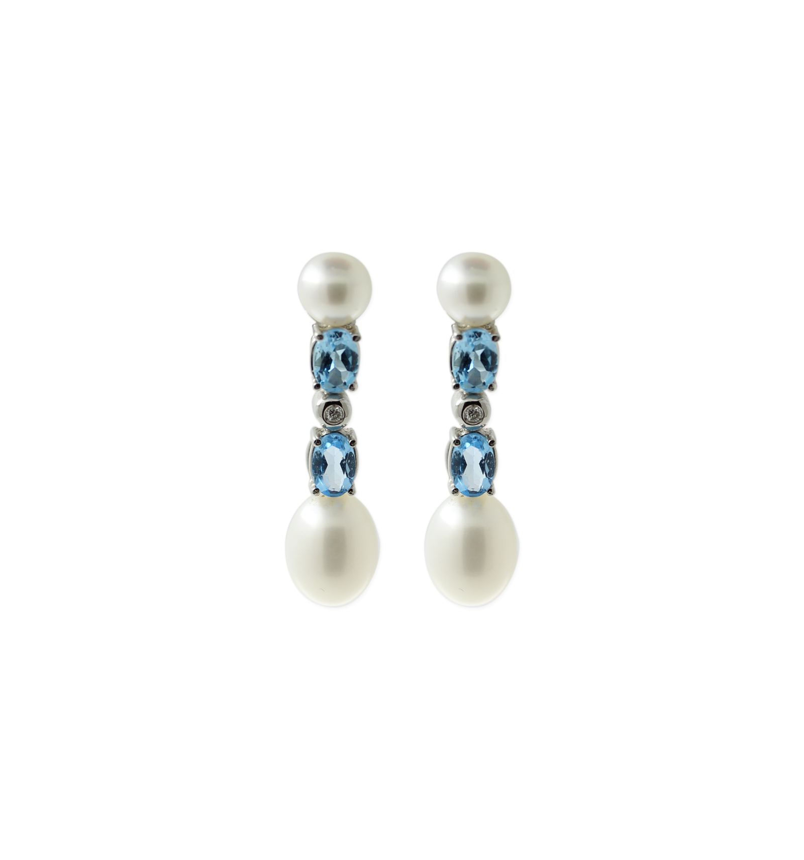Par de pendientes de oro blanco de 750 milésimas (18K) con diamantes talla brillante, perla cultivada y topacio azul.
