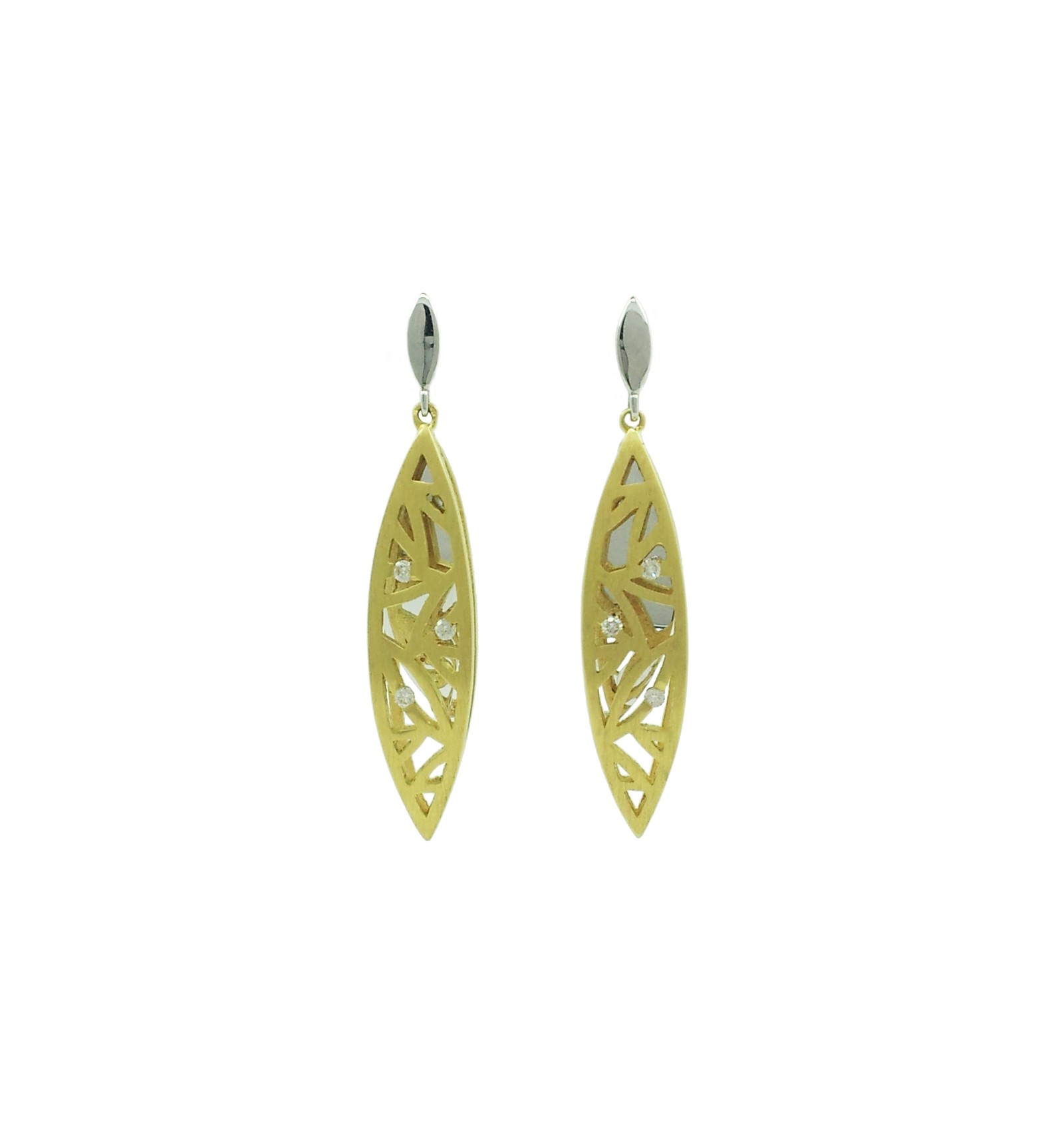 Montura calada de oro blanco en brillo y oro amarillo en mate con tres diamantes talla brillante engastados en cada uno.