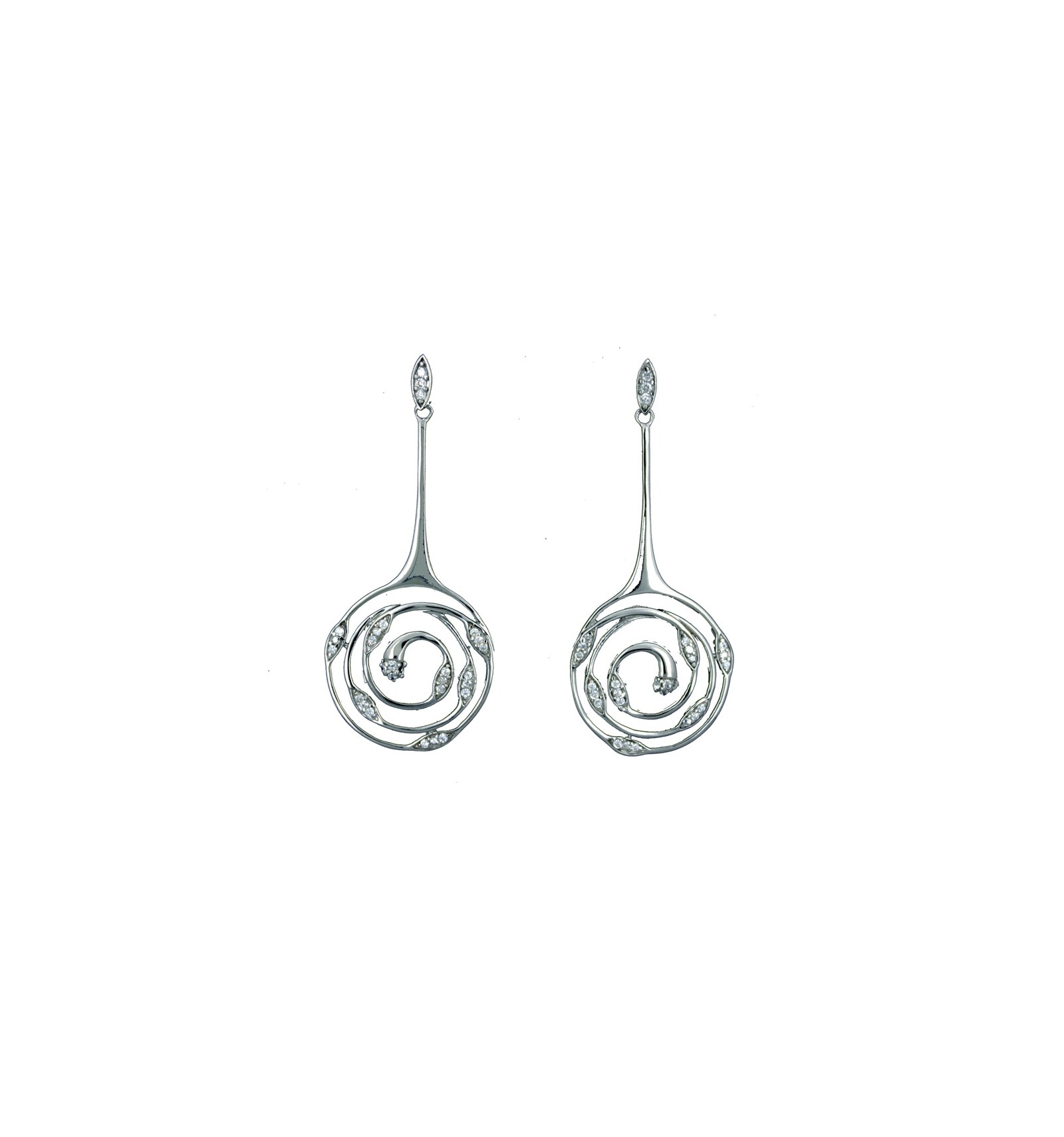 Pendientes rígidos de plata en brillo con circonitas blancas engastadas en un original diseño de espiral.