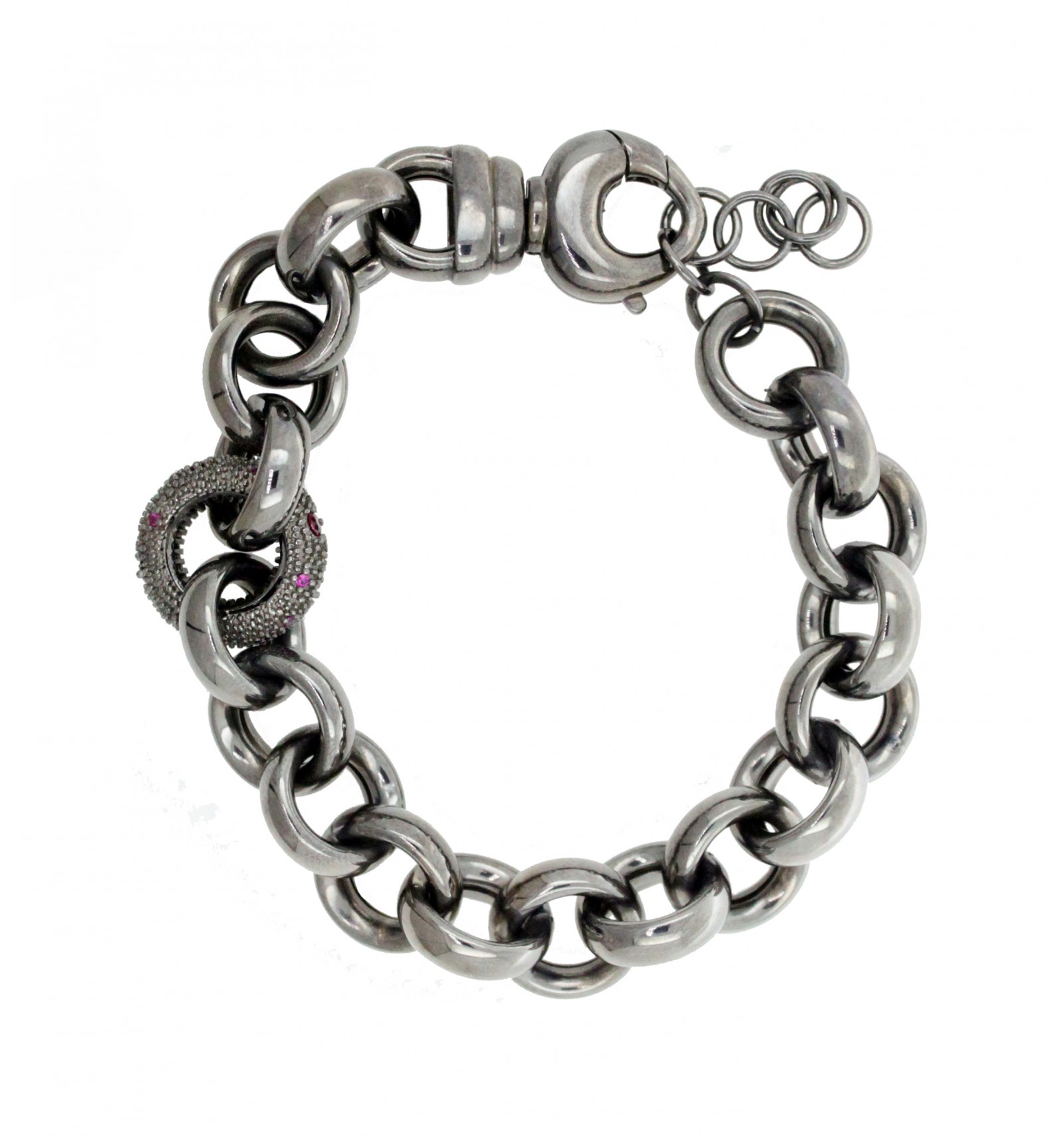 Pulsera de plata de 925 milésimas con baño de rutenio y circonitas rojas.
