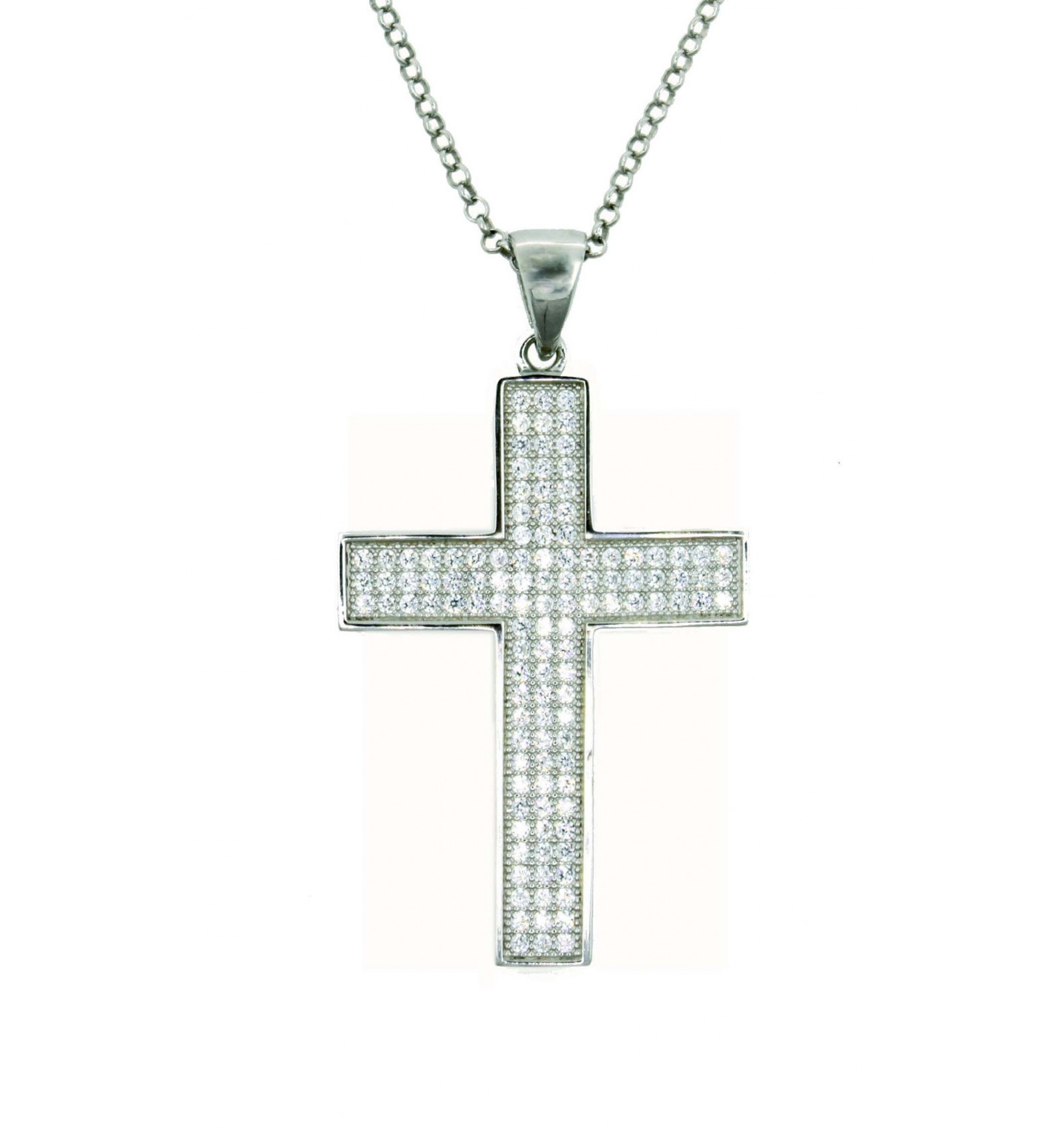 Cruz de plata rodiada de 925 milésimas con circonitas blancas.