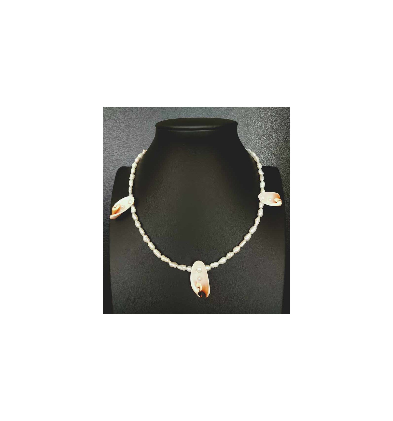 Collar de perlas aljofar naturales con tres conchas marinas pulidas.