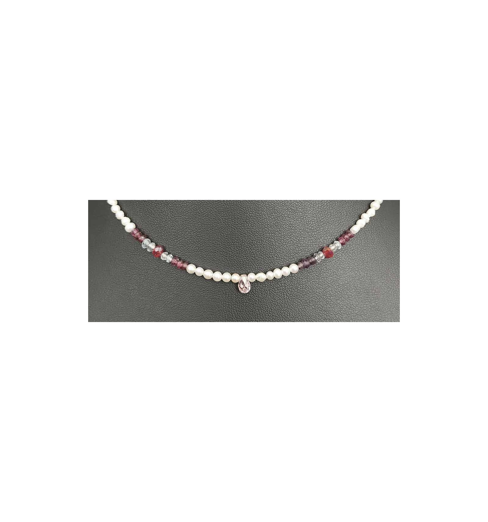 Collar realizado con la combinación de perlas aljofar y perlas cultivadas de 2.5-3 mm con piedras de colores intercaladas.