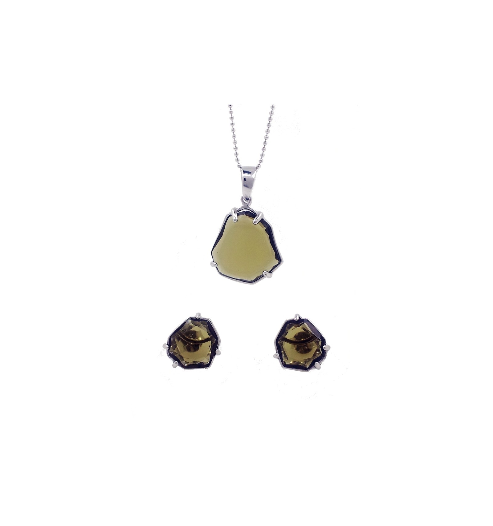 Conjunto con piedras irregularesres en tono marrón ahumado engastadas en cuatro garras.