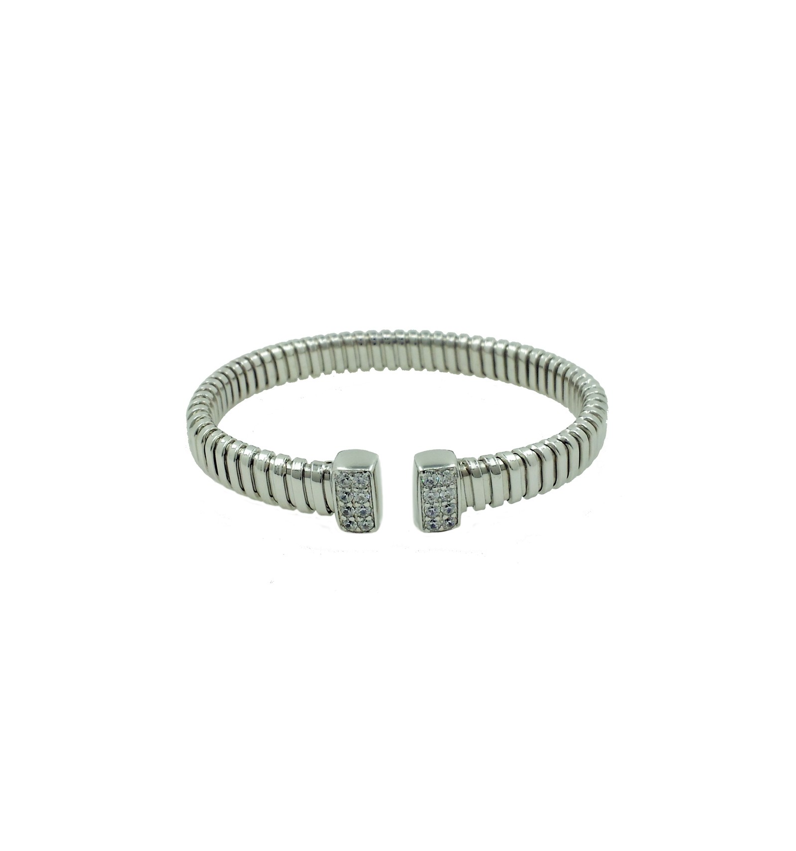Pulsera rígida de plata de 925 milésimas con detalles rectangulares engastados con circonitas blancas.