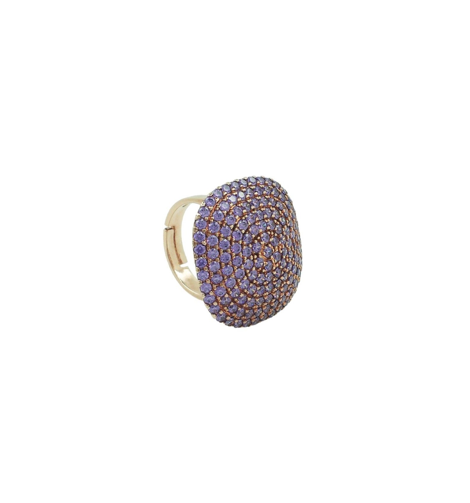 Espectacular sortija de plata con baño de oro rosa y circonitas de color amatista engastadas en un moderno diseño cuadrado.