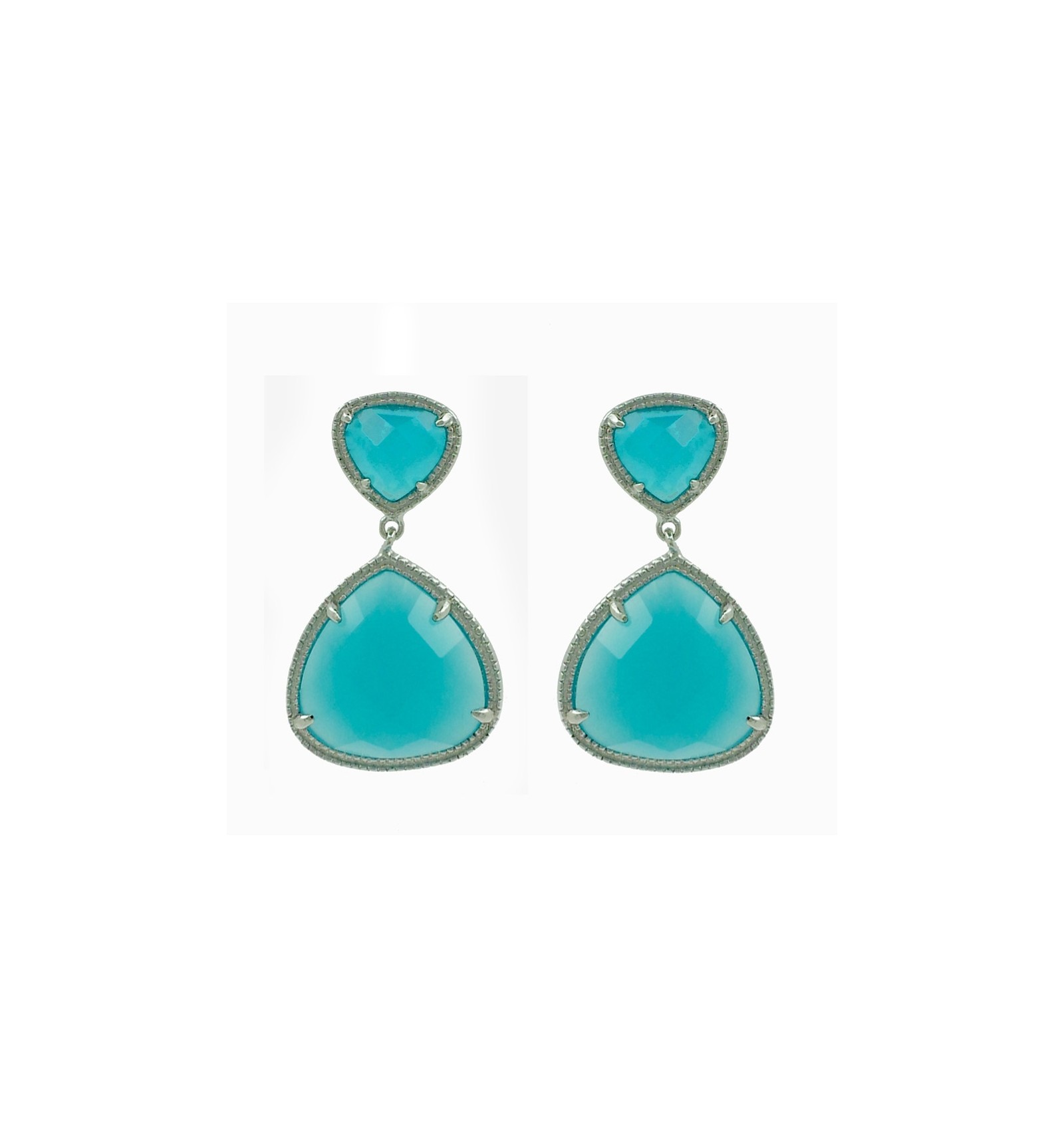 Dos piedras naturales azul Mar Caribe engastadas en cuatro garras en dos orlas triangulares, de diferente tamaño, con un dibujo en relieve.