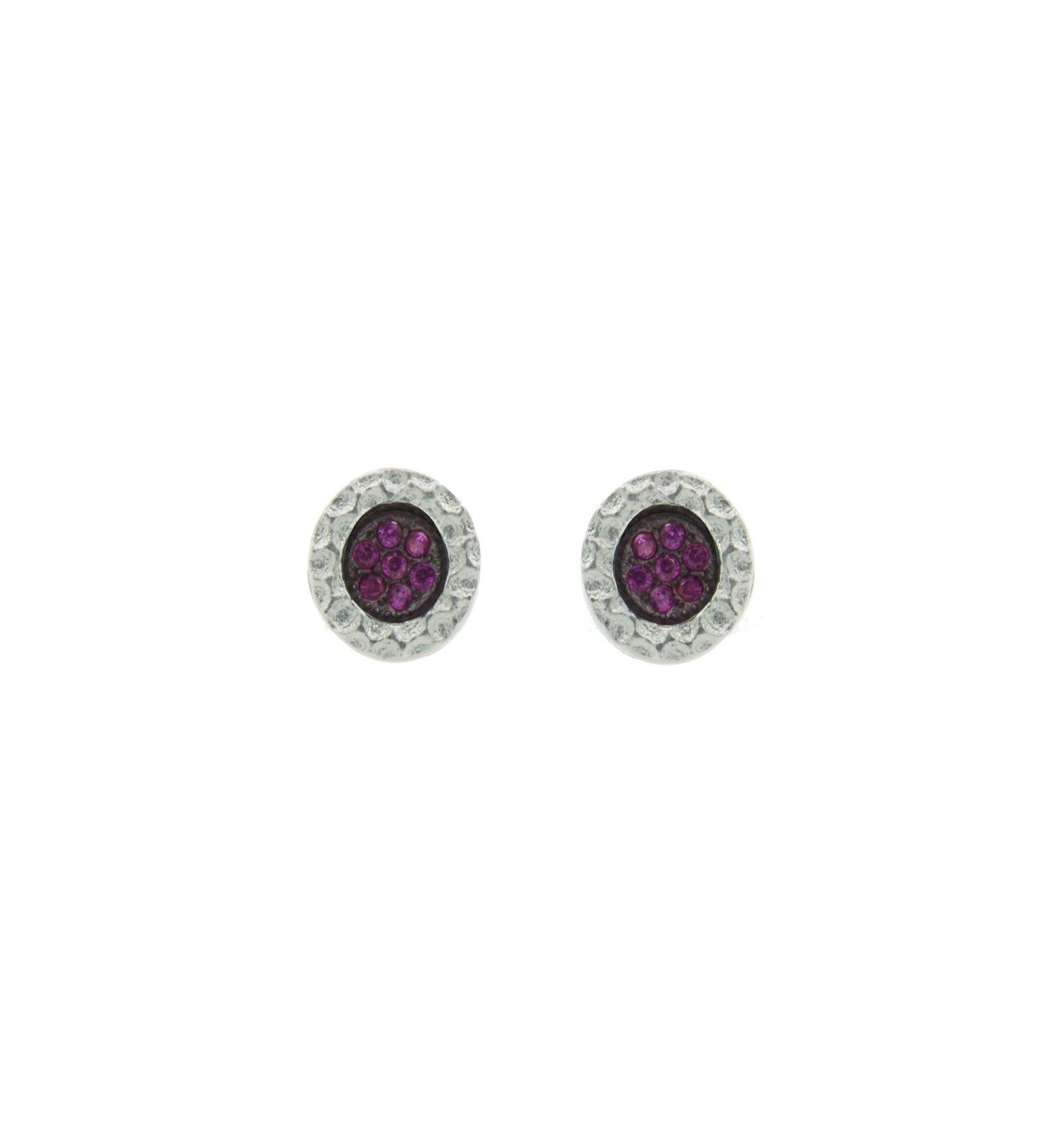 Montura redonda de plata con un original grabado en relive en mate y brillo con siete circonitas de color fucsia engastadas en el centro.