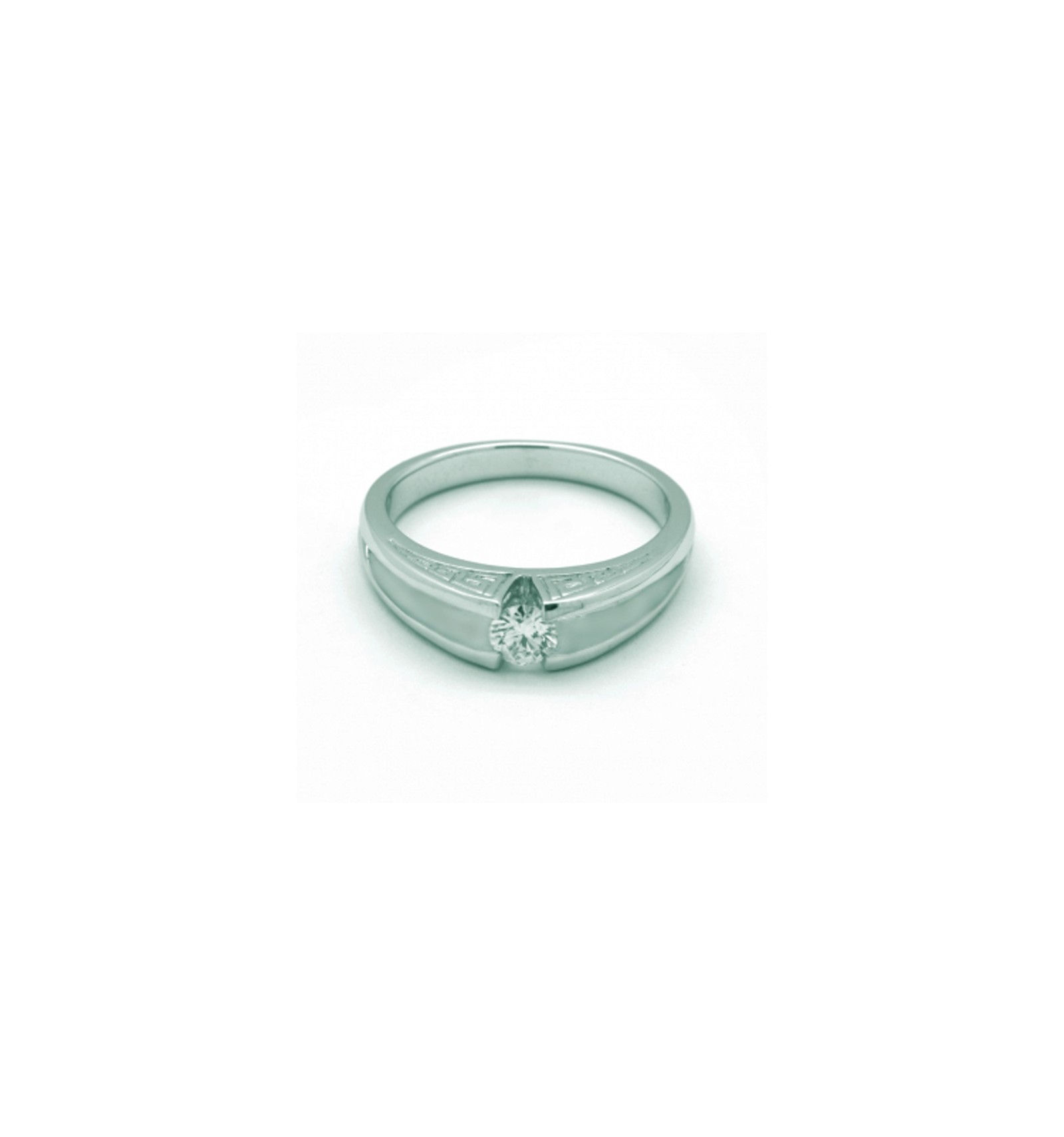 Montura calada de oro blanco en mate y brillo con detalle de grabado de greca.