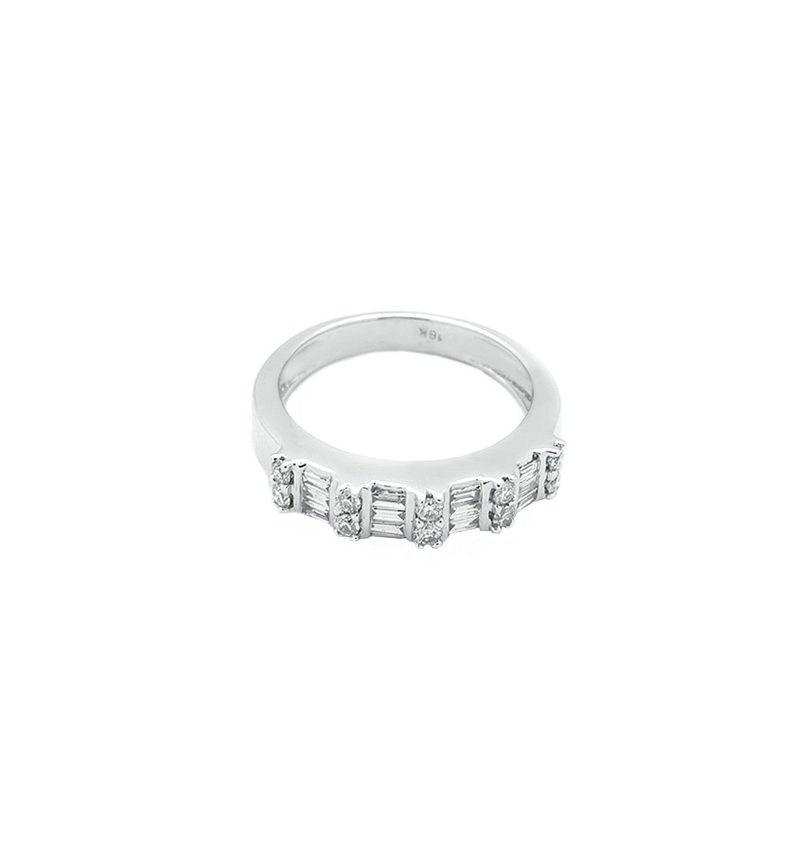 Sortija de oro blanco de 750 milésimas (18K) con 12 diamantes talla baguette y 10 diamantes talla brillante.