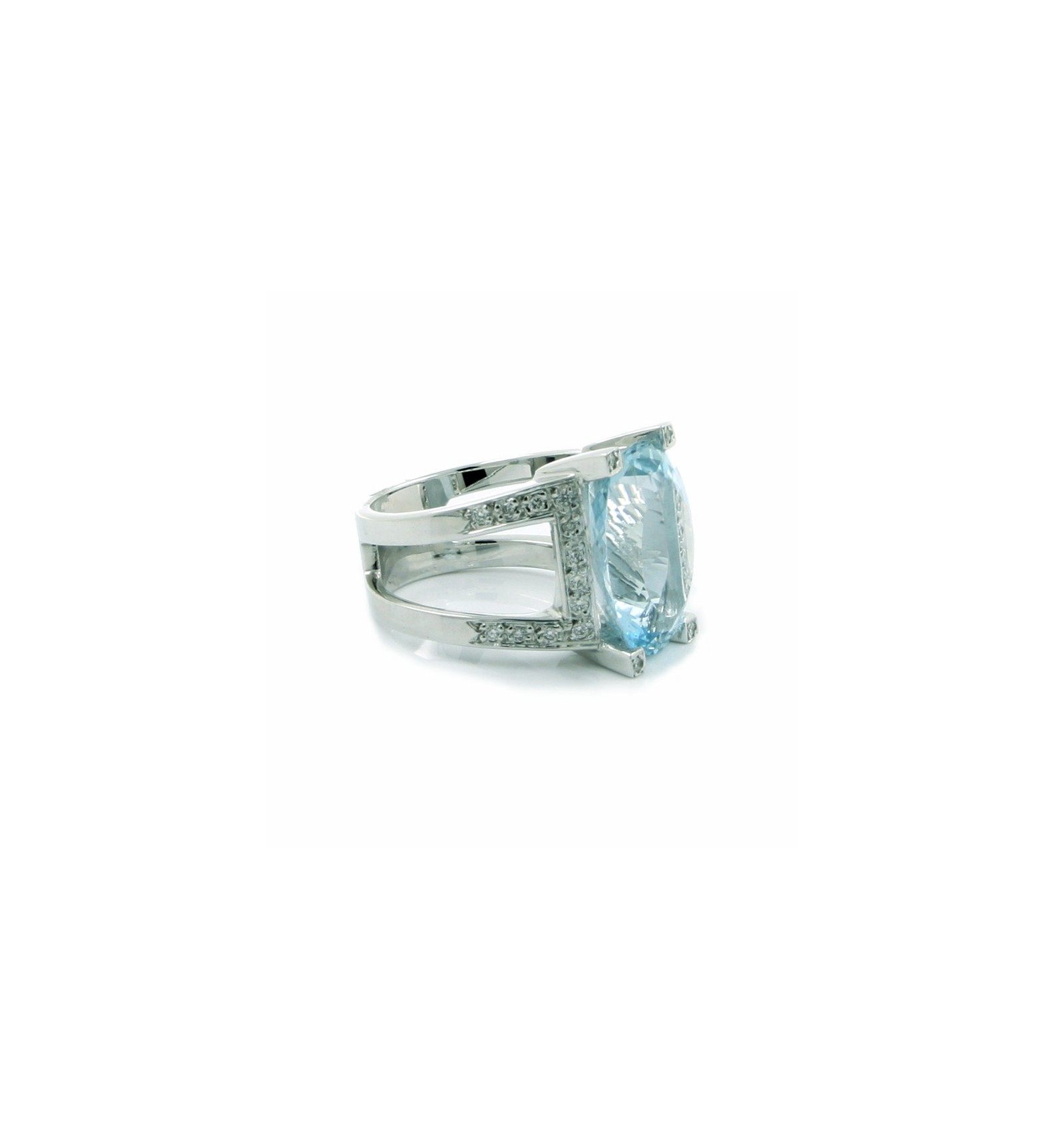 Sortija de oro blanco de 750 milésimas (18K) con aguamarina natural y 28 diamantes talla brillante.